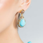 Gaia Earrings — grounded in strength and radiance, these statement teardrop earrings embody the essence of earth and sky. At the center, a luminous cabochon gemstone (available in multiple colorways) glows with brilliance, encircled by pavé crystals that amplify its light. Designed in a bold teardrop silhouette and finished in 2µ (AAA) hard gold-plated copper, the Gaia Earrings balance elegance with drama — an iconic demi-fine piece handcrafted by Filipino artisans for modern muses and collectors.