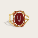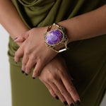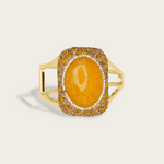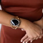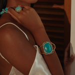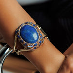 Gaia Sculptural Cuff — bold and luminous, this open cuff bracelet features an oval-cut gemstone centerpiece available in multiple colorways, framed with pavé-set crystals and gemstone chip inlays. Designed with a sculptural silhouette, it balances bold design with effortless wearability — an arresting demi-fine piece for collectors and stylists seeking editorial jewelry with timeless allure. Crafted in 2µ (AAA) hard gold-plated copper, designed in Las Vegas, and handcrafted with intention by Filipino artisans using responsibly sourced raw materials from Asia.