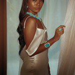 - Centerpiece: Oval-cut turquoise gemstone with pavé inspired setting