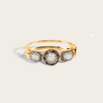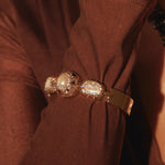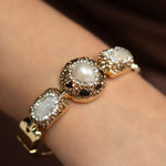 Nero Bangle- A bold harmony of elegance and mystique, the Nero Bangle captivates with its trio of luminous pearls, each framed in a halo of dark crystals that glimmer with quiet intensity. Set against a sleek gold band, the contrasting light and shadow evoke celestial orbs suspended in the night sky. Striking yet refined — a jewel that commands attention while whispering of mystery and allure.