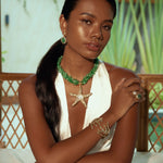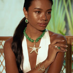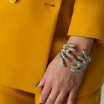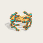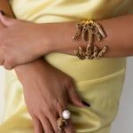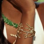 Sirena Claw Cuff — inspired by coral branches, this sculptural openwork cuff bracelet wraps dramatically around the wrist, encrusted with gemstone chips for organic texture. Each claw-like curve shimmers with oceanic strength, crowned in warm 2µ (AAA) hard gold-plated copper. Designed as a demi-fine collector’s piece, it merges strength, elegance, and ocean-inspired artistry. Handcrafted by Filipino artisans using responsibly sourced raw materials, and designed in Las Vegas.