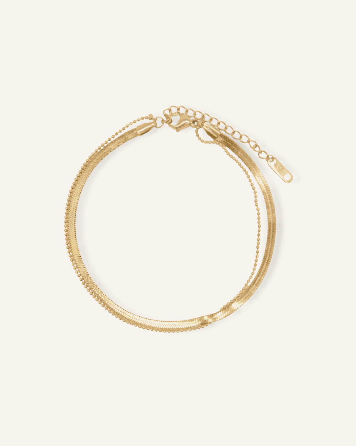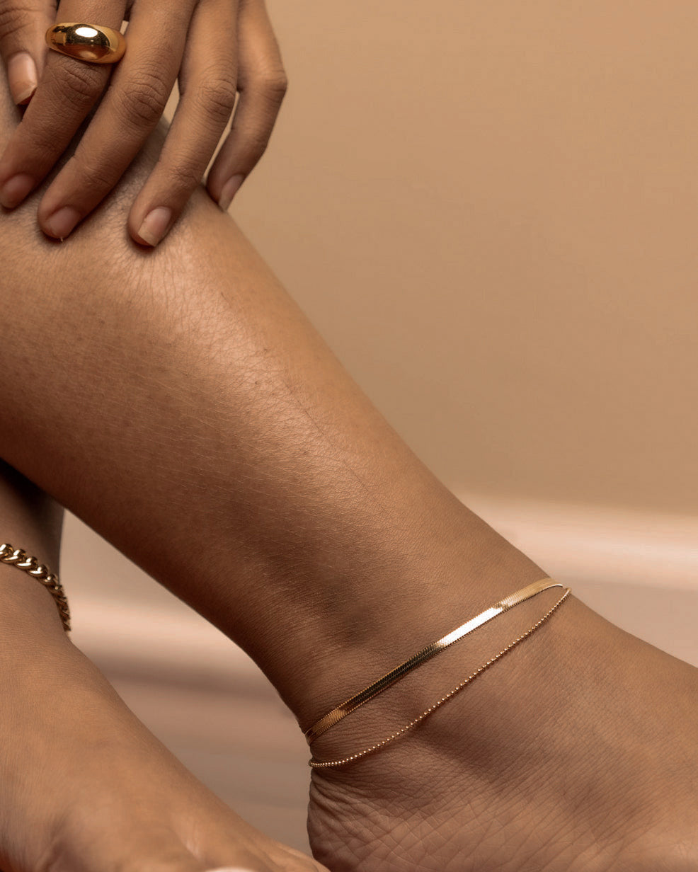 A reinvention of the classics, the Sophia Anklet is a minimal yet eye-catching herringbone style piece that has an addition of a small beaded chain, designed to glisten freely along with it. Amble and wander with confidence and shine on every step with this stunning bijouterie.
