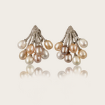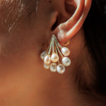 A sculptural cluster of freshwater pearls that cascade with movement, these earrings embody the drama and opulence of the sea. Finished with golden pavé caps, they balance fluid elegance with bold editorial presence — perfect for collectors and statement styling.