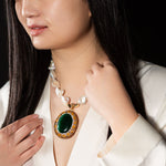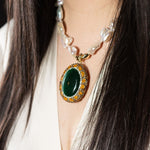 The Regalia Necklace — commanding and iconic, this oversized cat’s eye pendant is paired with chunky baroque pearls and accented in radiant gold. Available in four striking colorways — Green, Blue, Red, and Violet — this demi-fine collector’s necklace balances oversized proportions with timeless allure. Finished in 2µ (AAA) hard gold-plated copper, it is designed as a bold statement piece for modern icons, merging baroque pearl grandeur with gemstone brilliance. Handcrafted by Filipino artisans using responsibly sourced raw materials, and designed in Las Vegas.