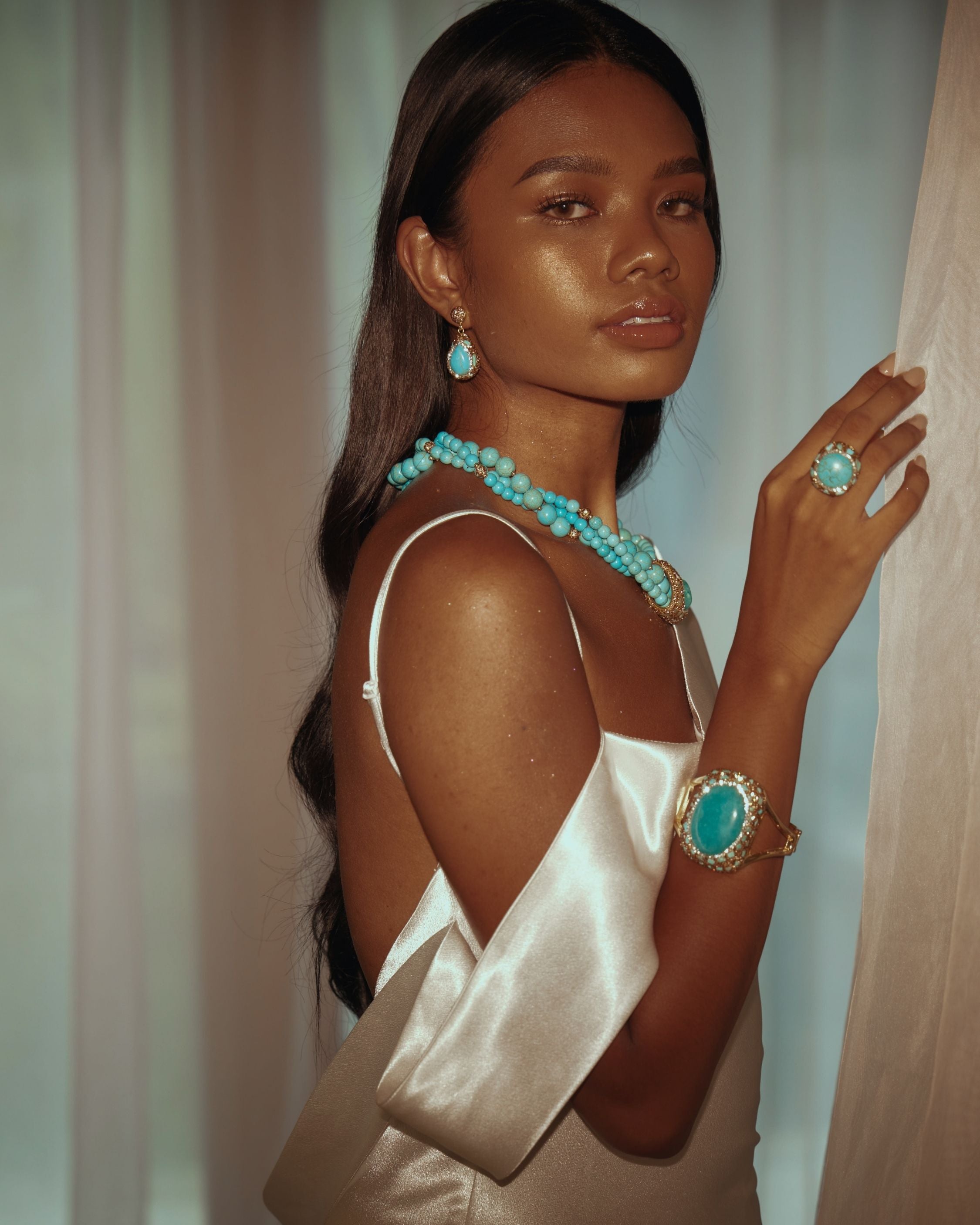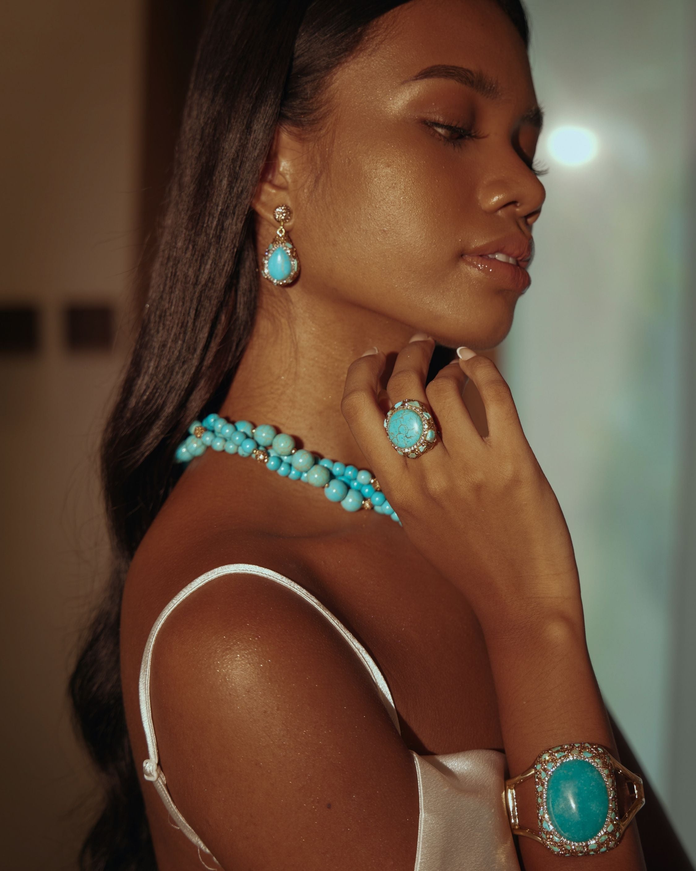 Radiant and commanding, the Gaia Cocktail Ring embodies the essence of earth and sky. A striking turquoise cabochon sits at the center, encircled by pavé crystals that amplify its natural brilliance. Its bold teardrop silhouette and luminous contrast create a statement of balance, beauty, and timeless allure — a true icon for collectors and modern muses.