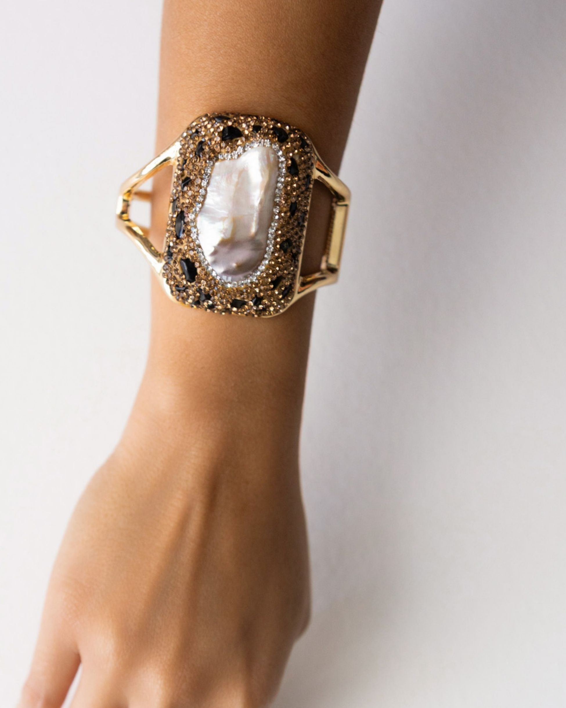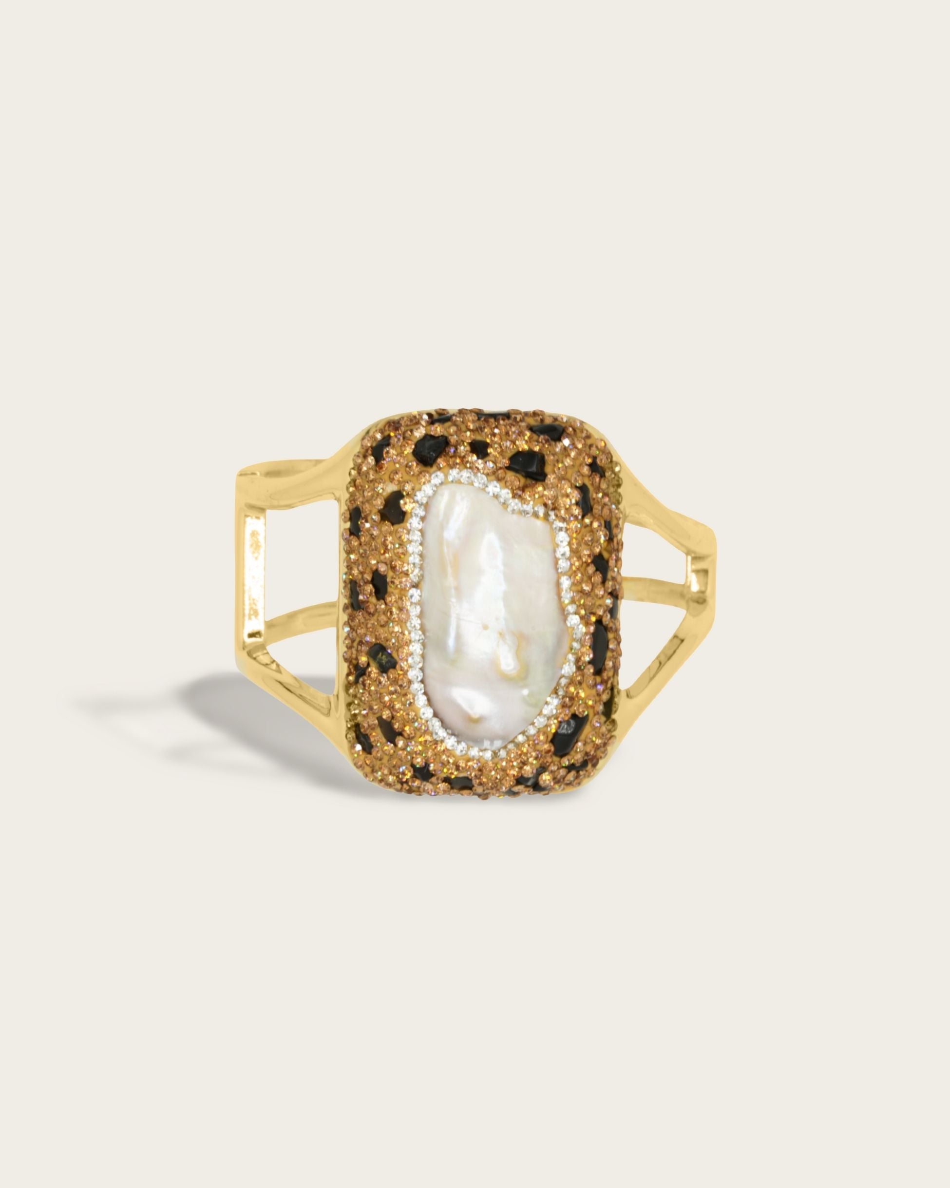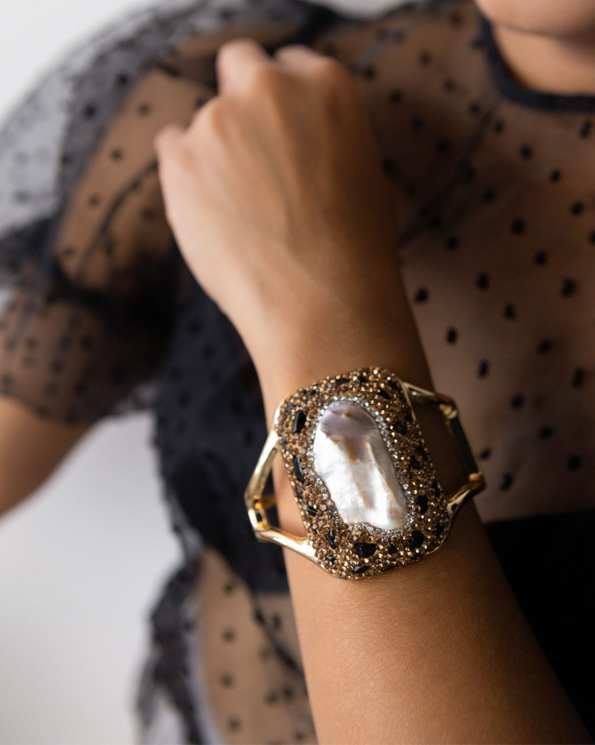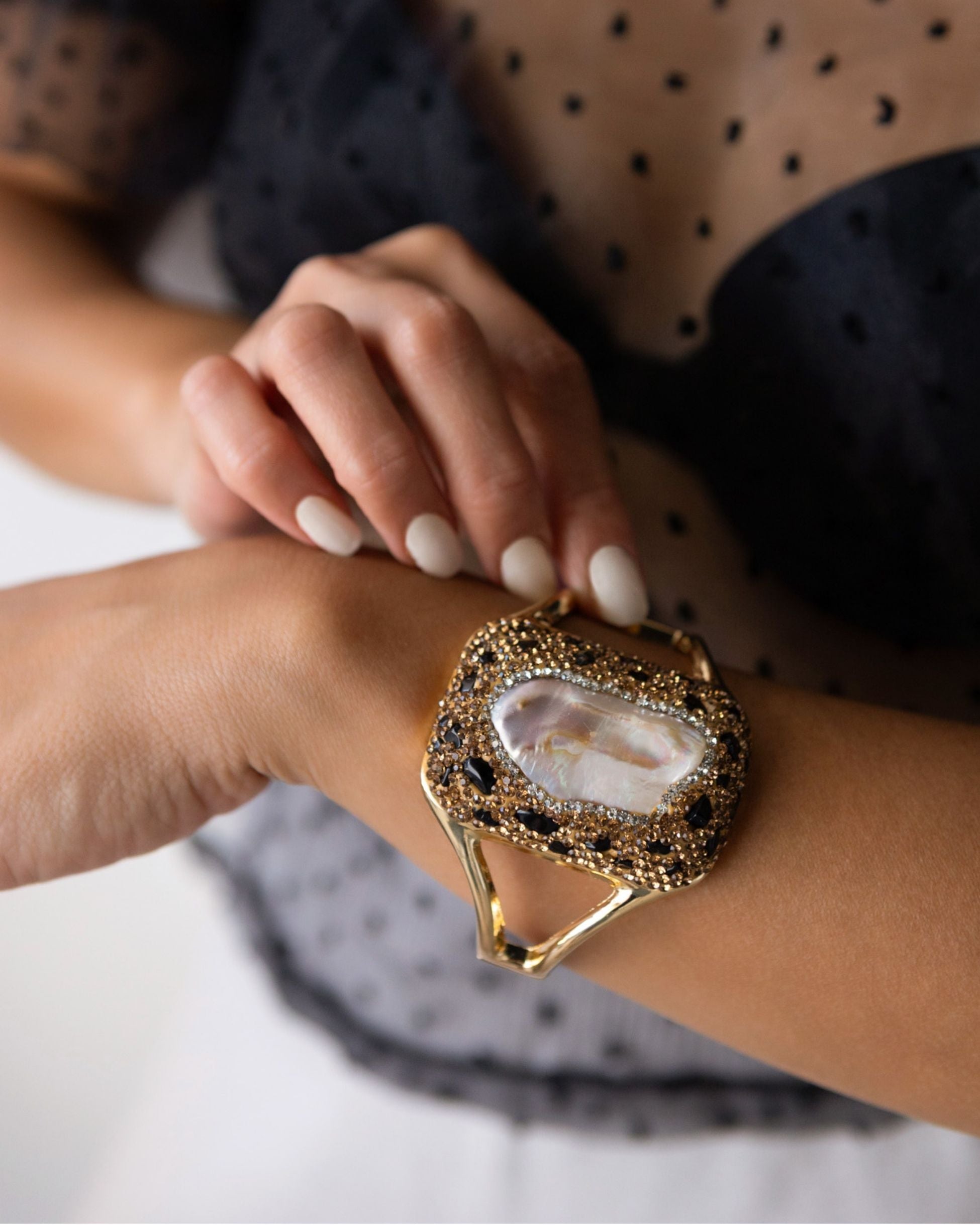 Nero Heart of Mare- Cuff - A bold harmony of elegance and mystique, the Nero Heart captivates with its trio of luminous pearls, each framed in a halo of dark crystals that glimmer with quiet intensity. Set against a sleek gold band, the contrasting light and shadow evoke celestial orbs suspended in the night sky. Striking yet refined — a jewel that commands attention while whispering of mystery and allure.