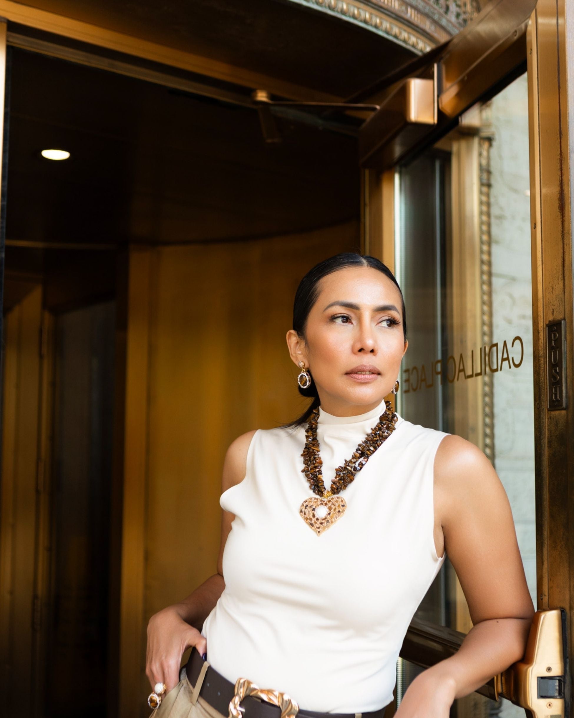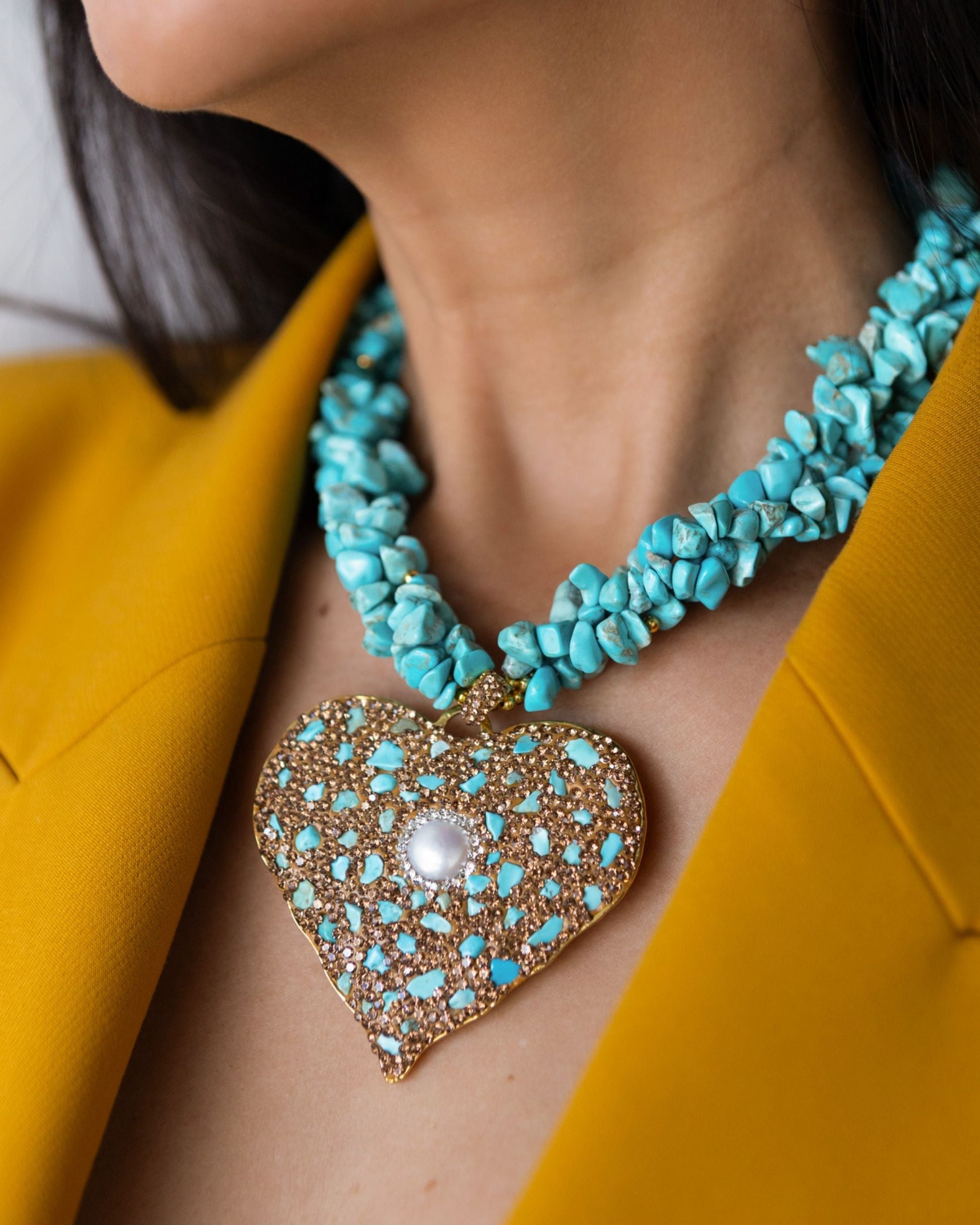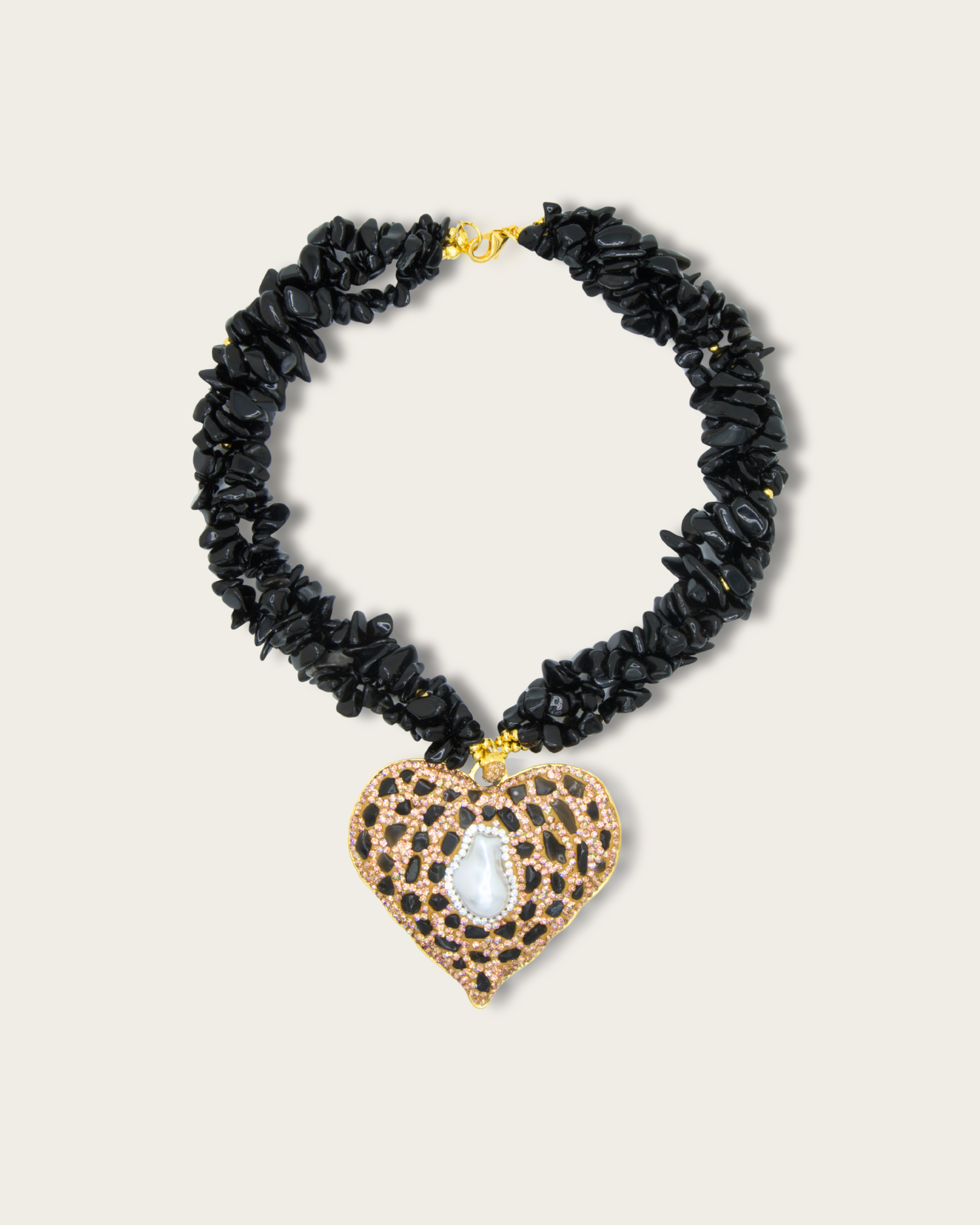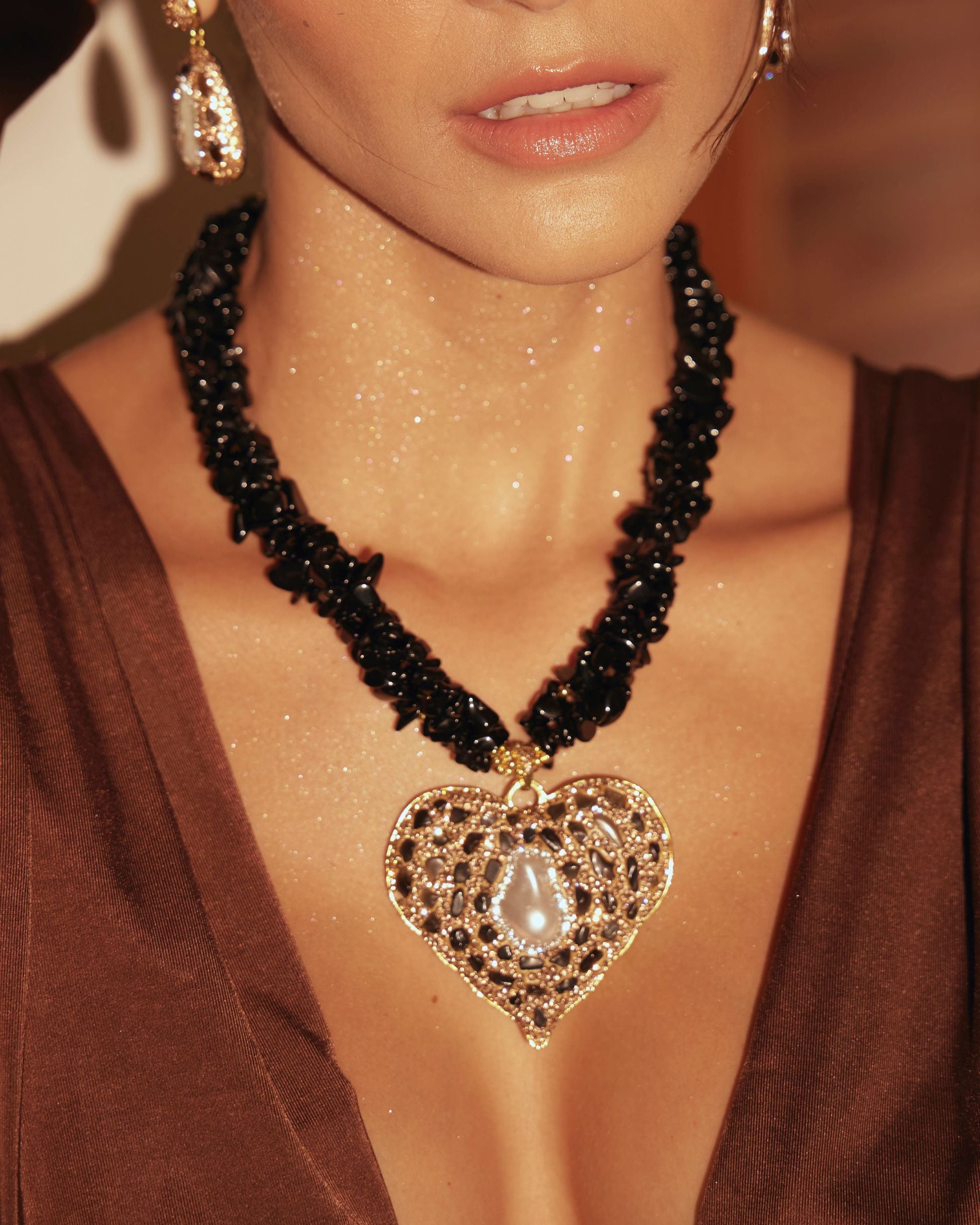 Nero Heart of Mare Necklace — a bold heart-shaped gemstone pendant available in multiple colorways, crowned with a luminous baroque pearl centerpiece and framed by gemstone chips. Finished in 2µ (AAA) hard gold-plated copper, this demi-fine statement necklace merges the richness of natural gemstones with the timeless elegance of pearls. Designed in Las Vegas and handcrafted with intention by Filipino artisans using responsibly sourced raw materials from Asia.