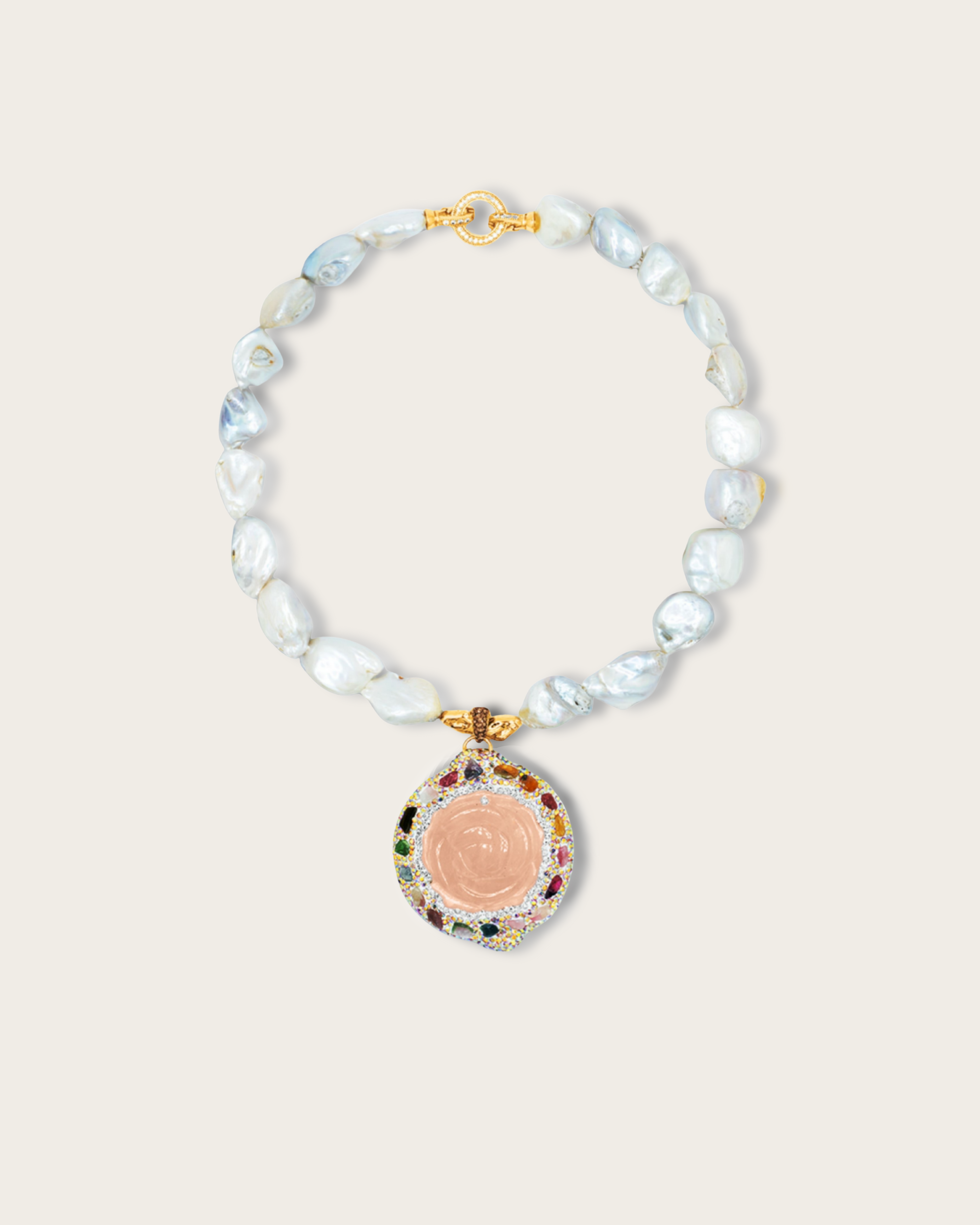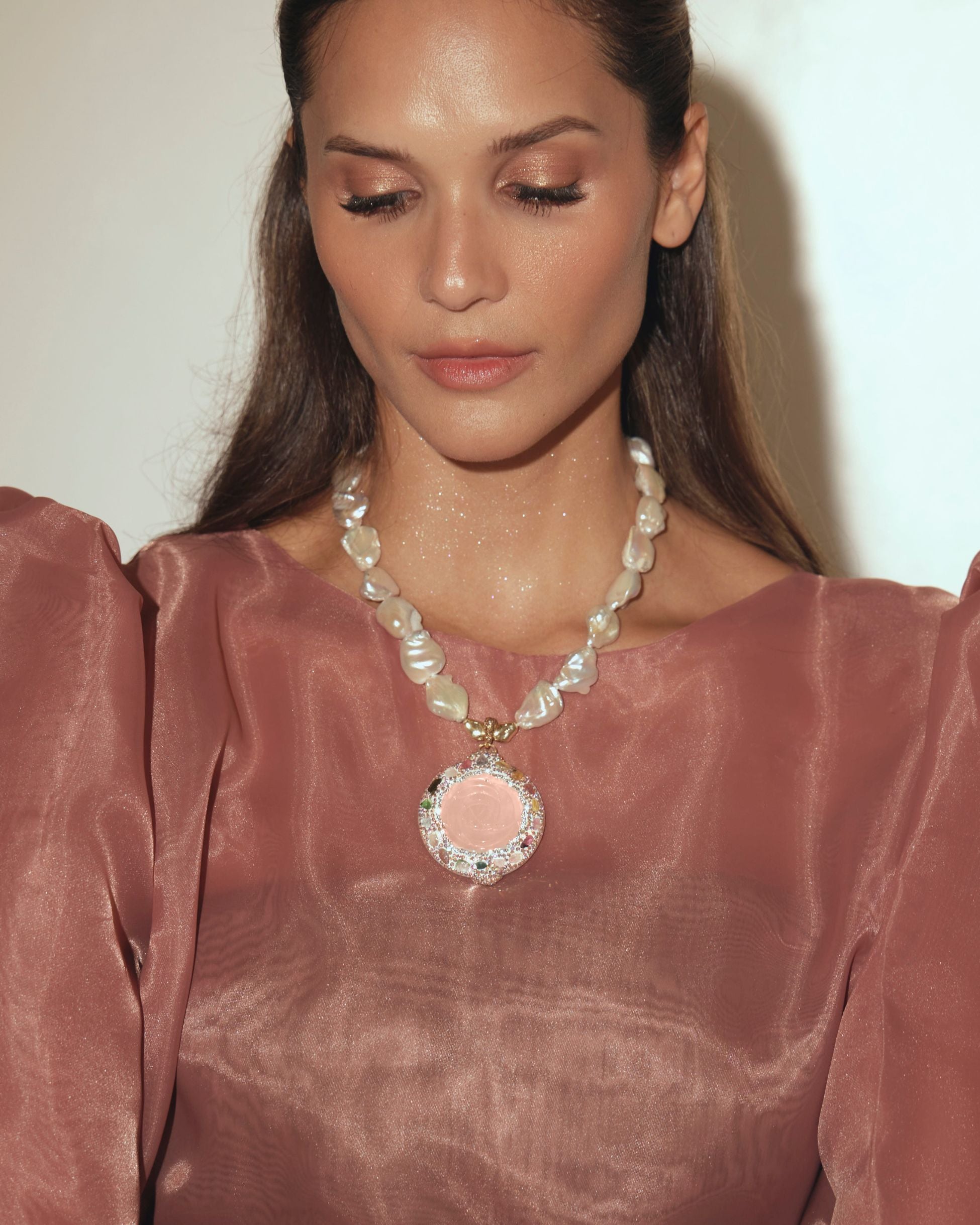 - Pendant: Rose quartz medallion with crystal pavé
