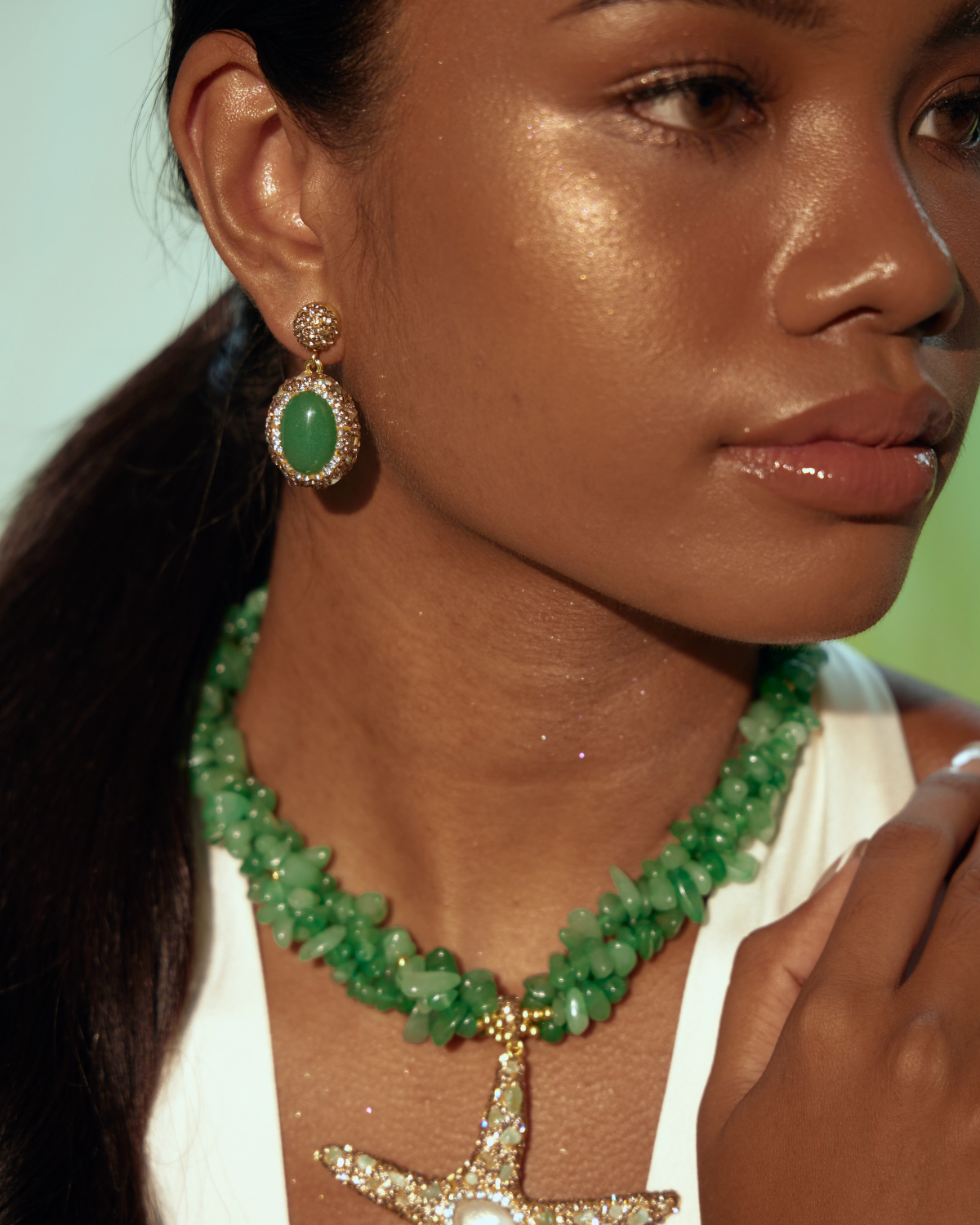 - Centerpiece: Green gemstone cabochon with pavé crystal frame