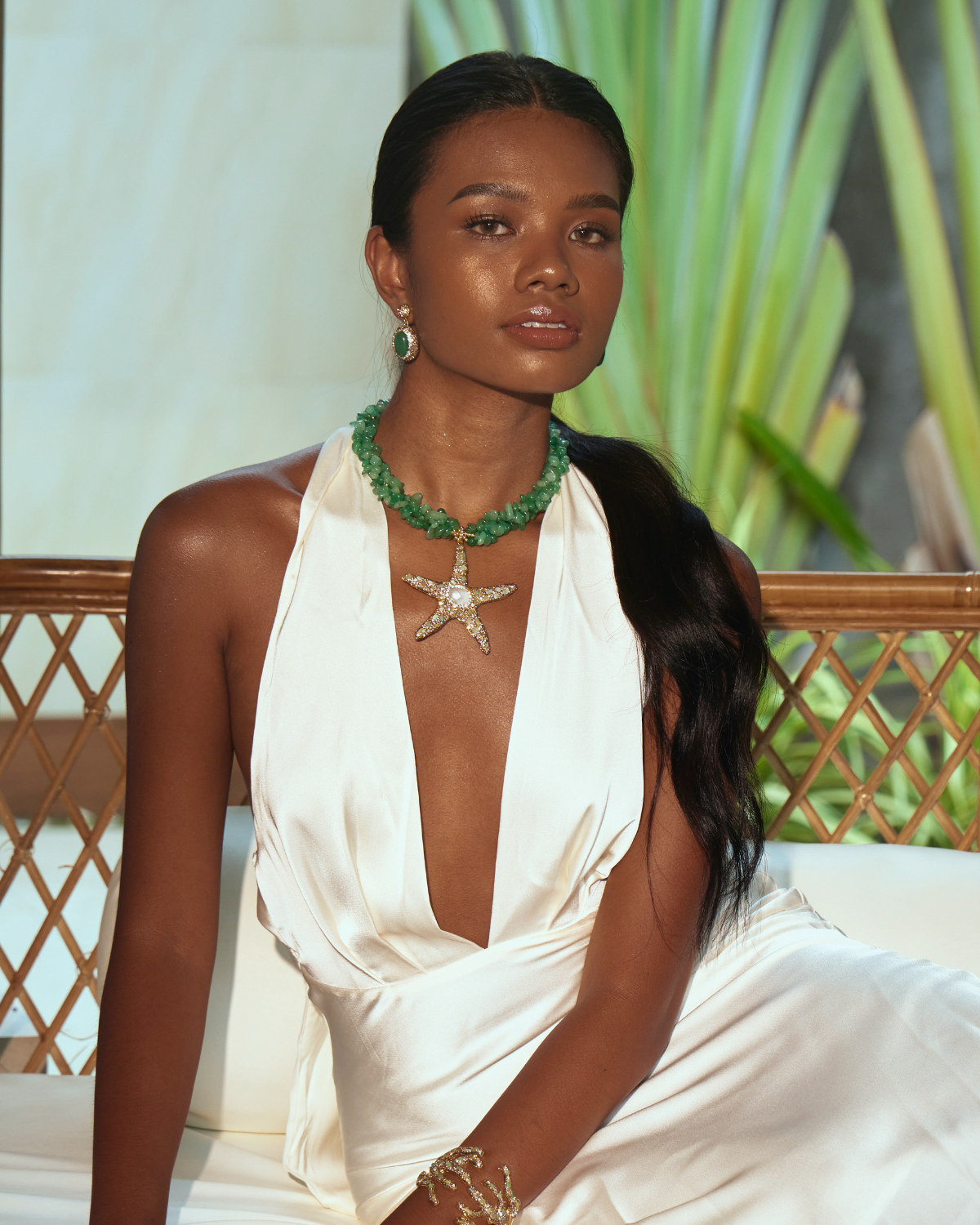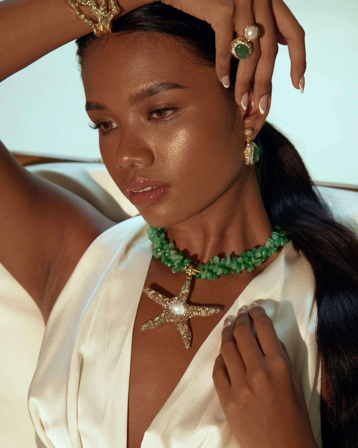 Sirena Verde Drop Earrings — embodying oceanic elegance, these statement dangle earrings feature verdant cabochon gemstones framed in shimmering pavé crystals. Their fluid silhouette captures both strength and grace, offering a dramatic ode to timeless glamour. Finished in 2µ (AAA) hard gold-plated copper, the Sirena Verde Drops are a demi-fine collector’s piece, perfect for bold evening styling and editorial statement looks. Designed in Las Vegas and handcrafted by Filipino artisans using responsibly sourced raw materials.