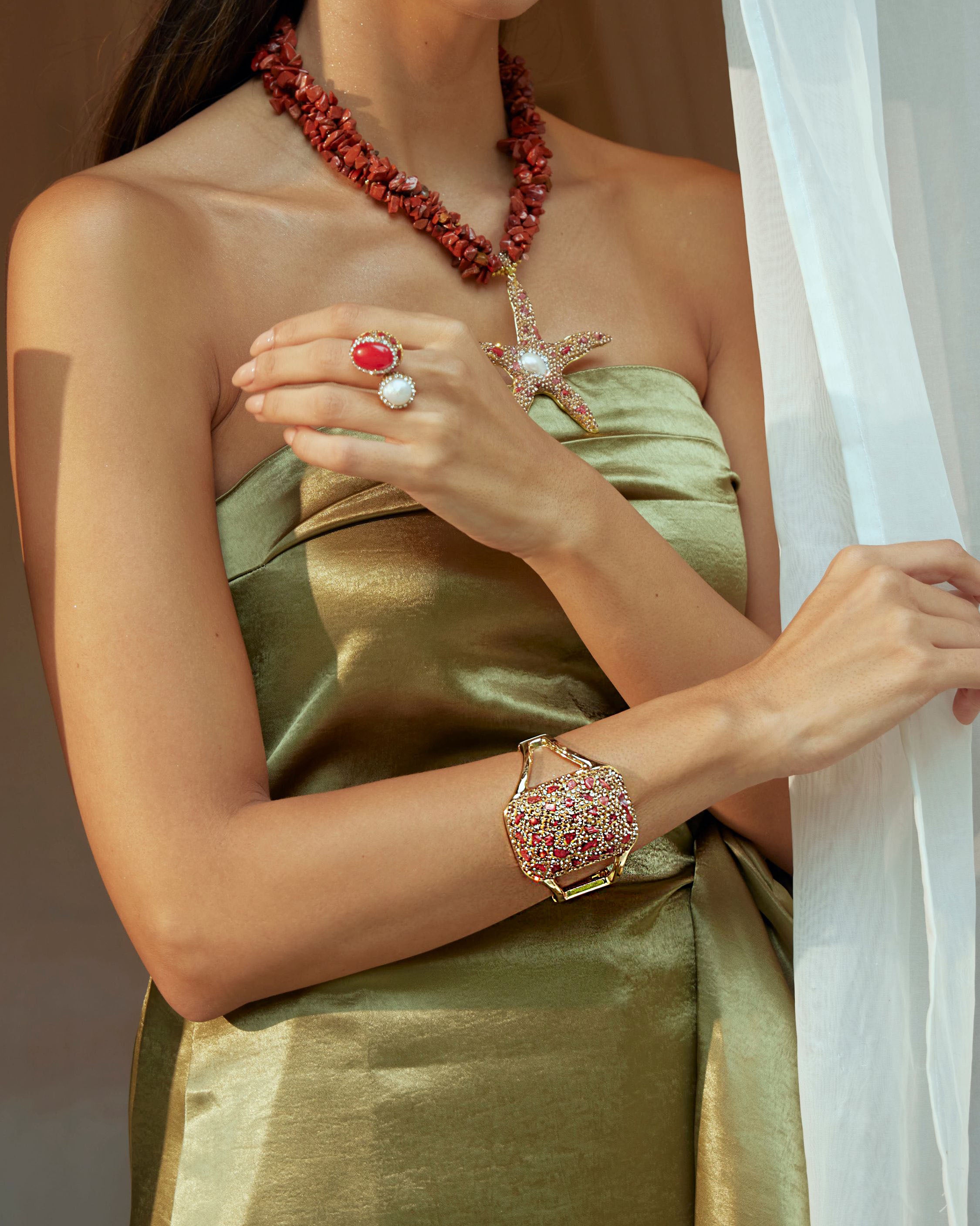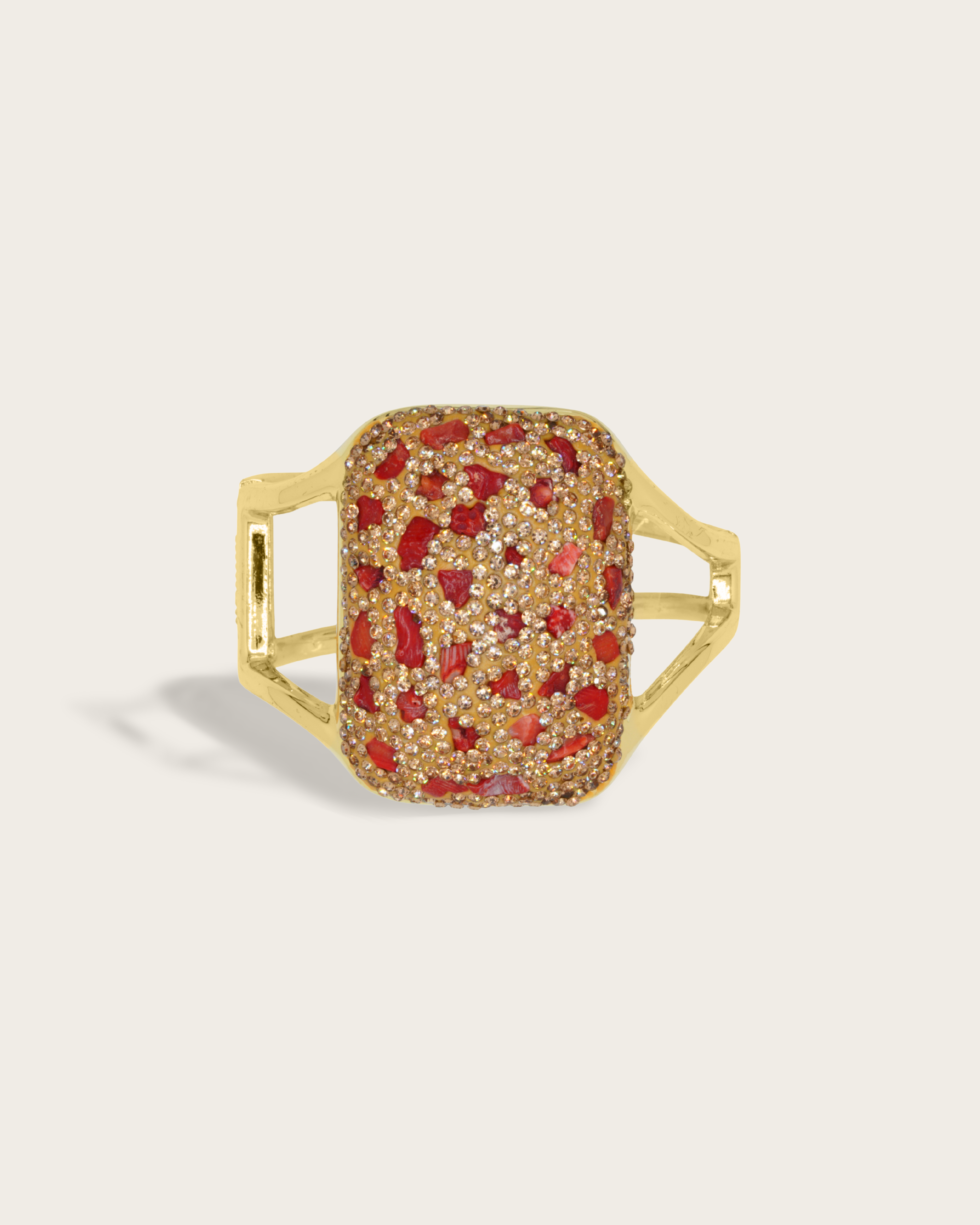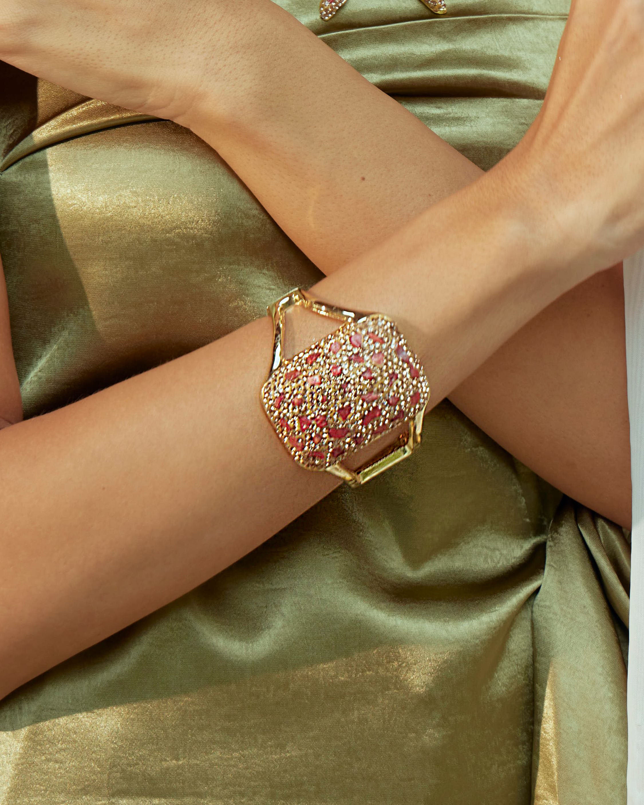 Solara Cuff — striking and radiant, this sculptural openwork cuff bracelet embodies the fiery energy of the sun. Featuring a mosaic of red jasper chips and shimmering pavé-set accents, it balances bold strength with dramatic sophistication. Finished in 2µ (AAA) hard gold-plated copper, the Solara Cuff is an artisan-crafted demi-fine collectible that commands attention — a statement piece designed in Las Vegas and handcrafted by Filipino artisans using responsibly sourced raw materials.