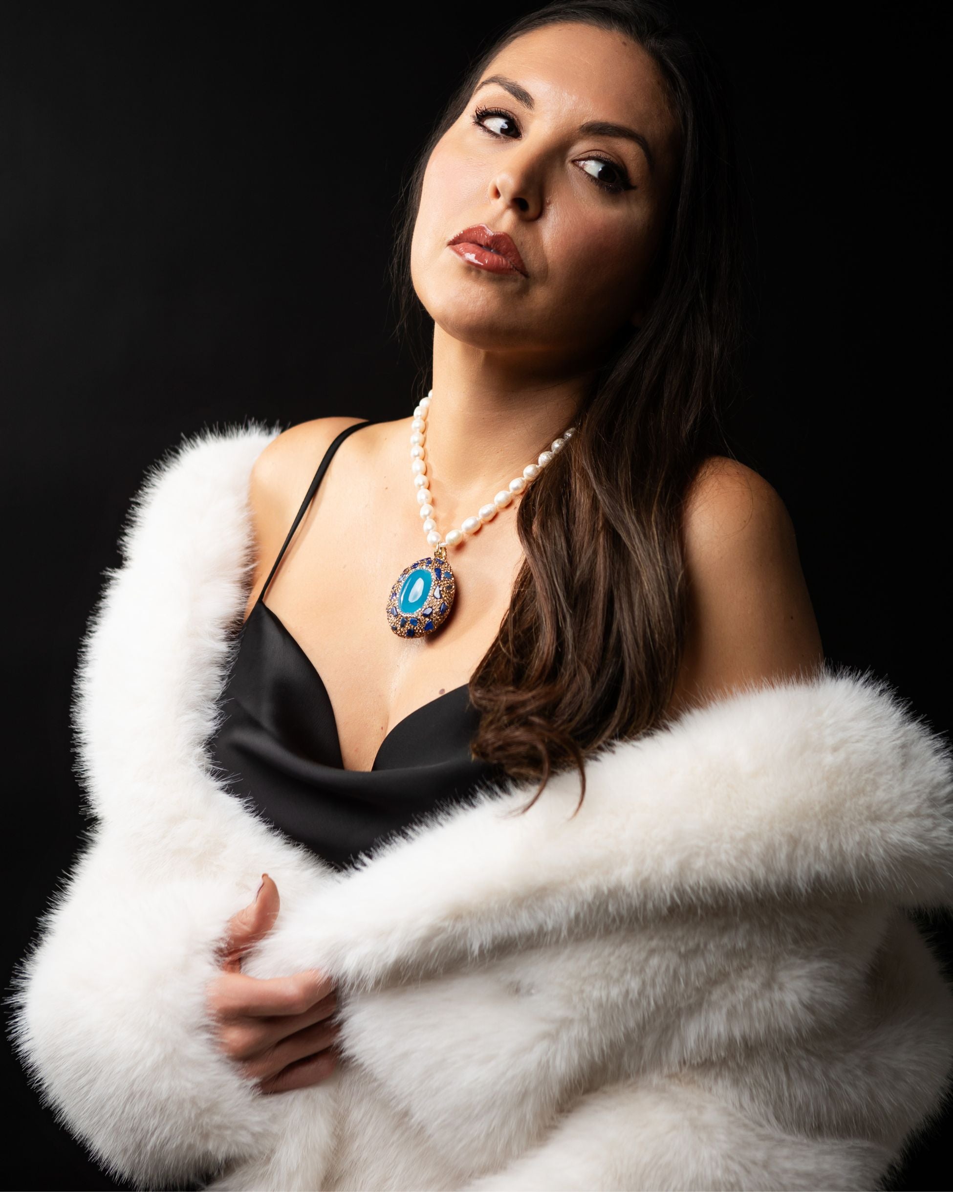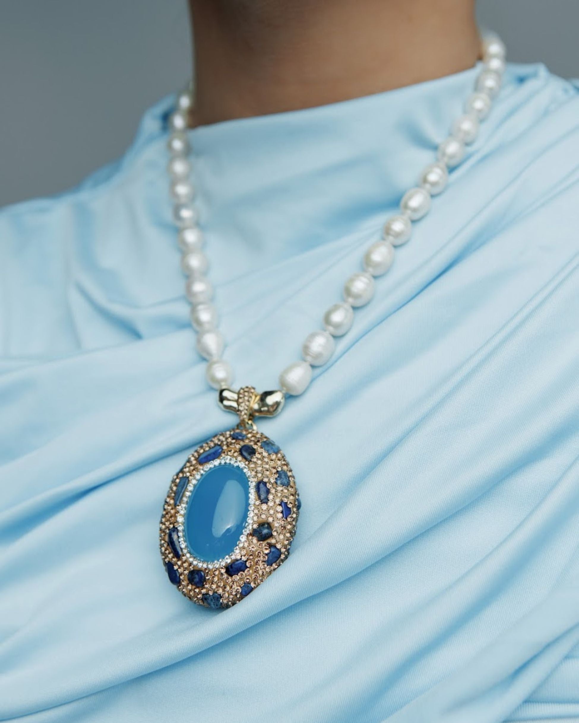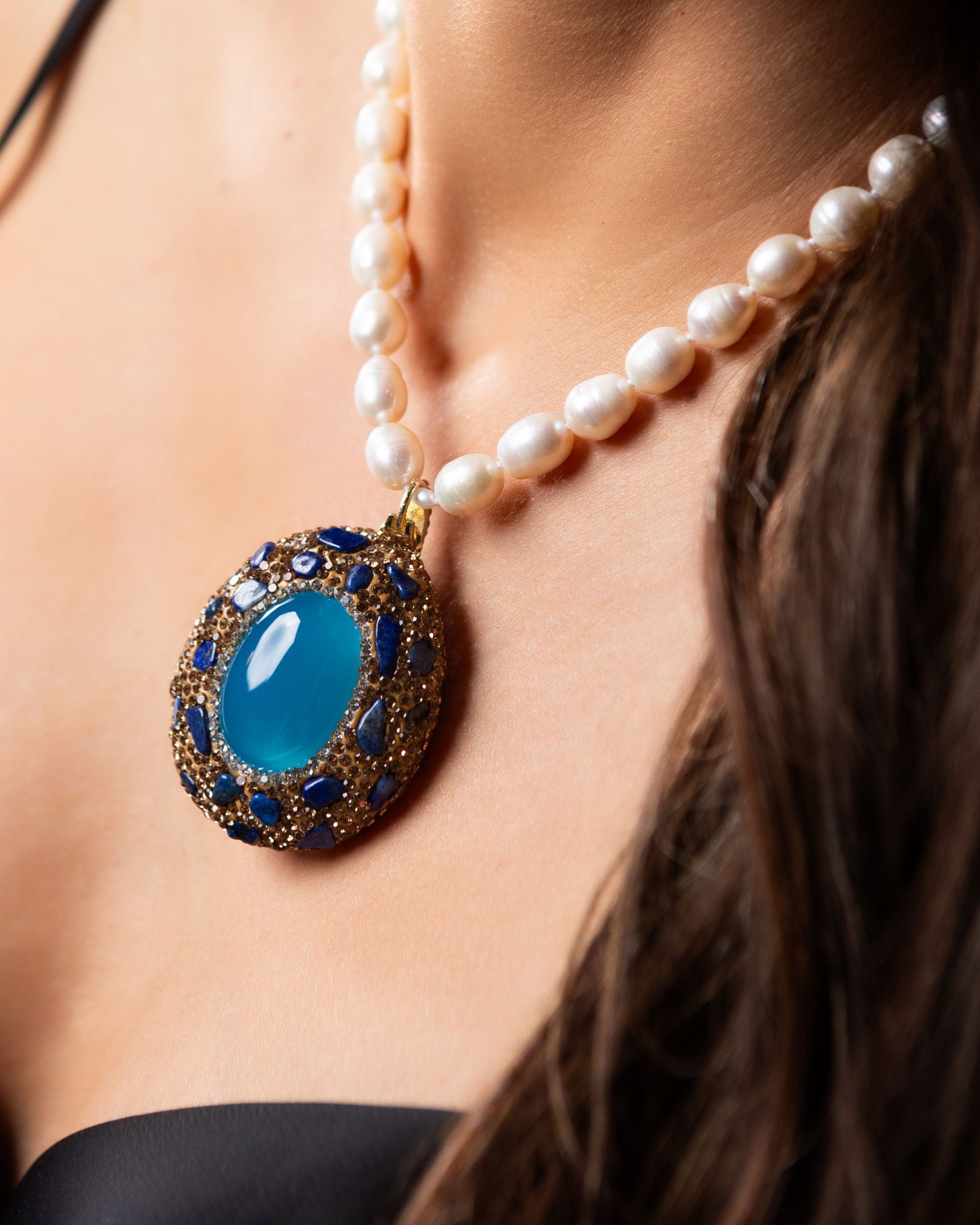 Sybil Turquoise Opal Stone Pendant Necklace — a striking cat’s eye cabochon framed with zirconia pavé and suspended from luminous freshwater Biwa pearls. Finished in 18K micron gold-plated brass, this demi-fine statement piece reflects artisanal craftsmanship, designed in Las Vegas and handcrafted with intention by Filipino artisans using responsibly sourced raw materials from Asia.