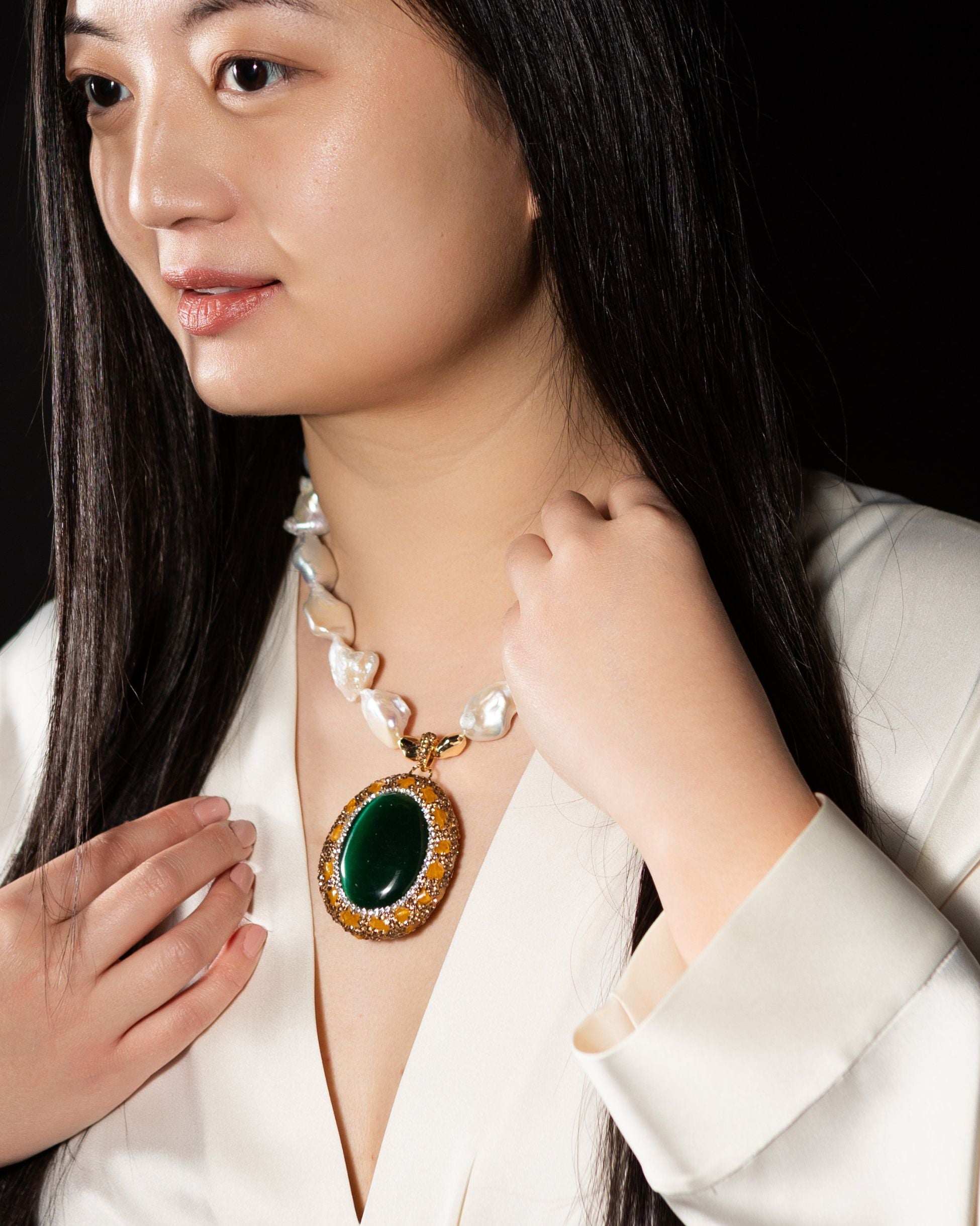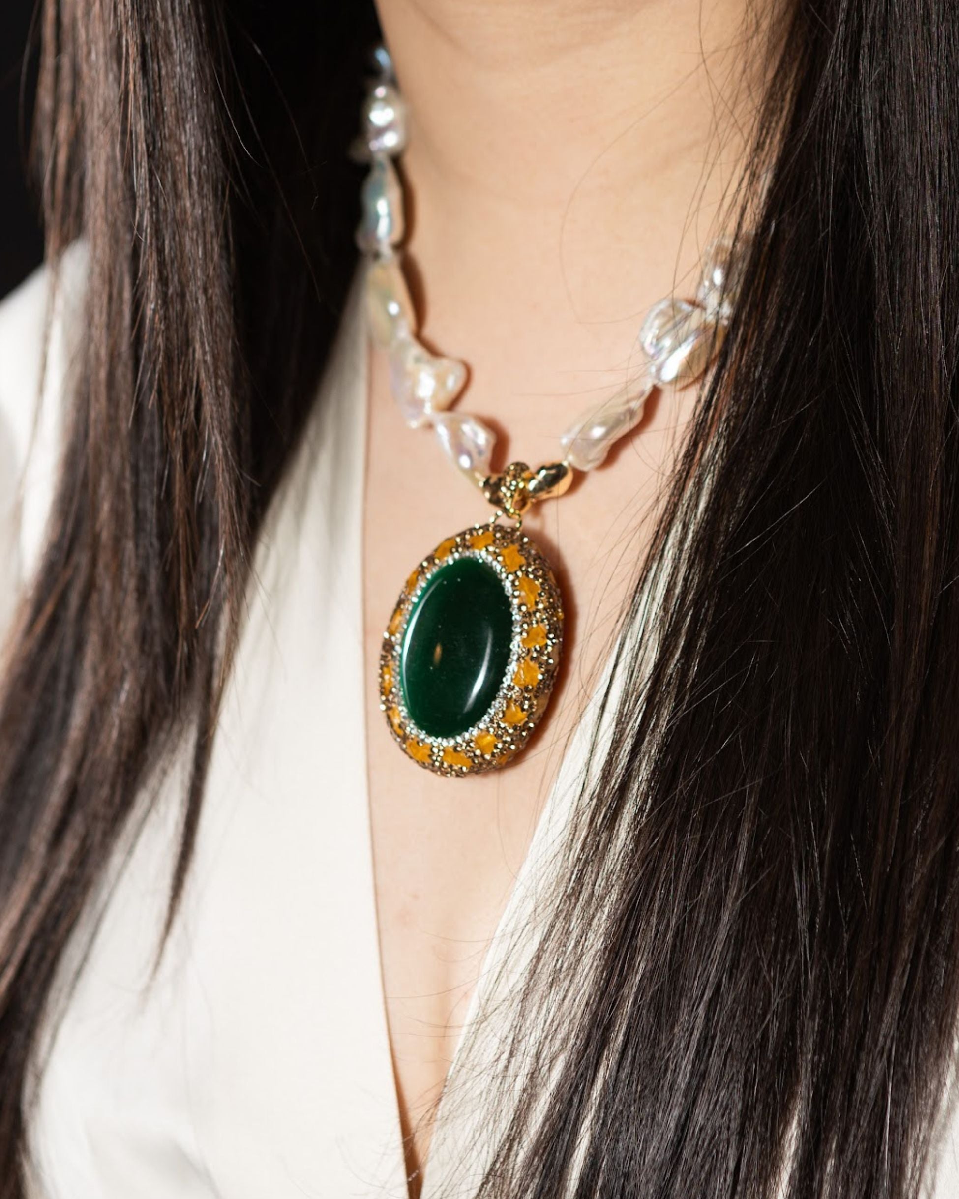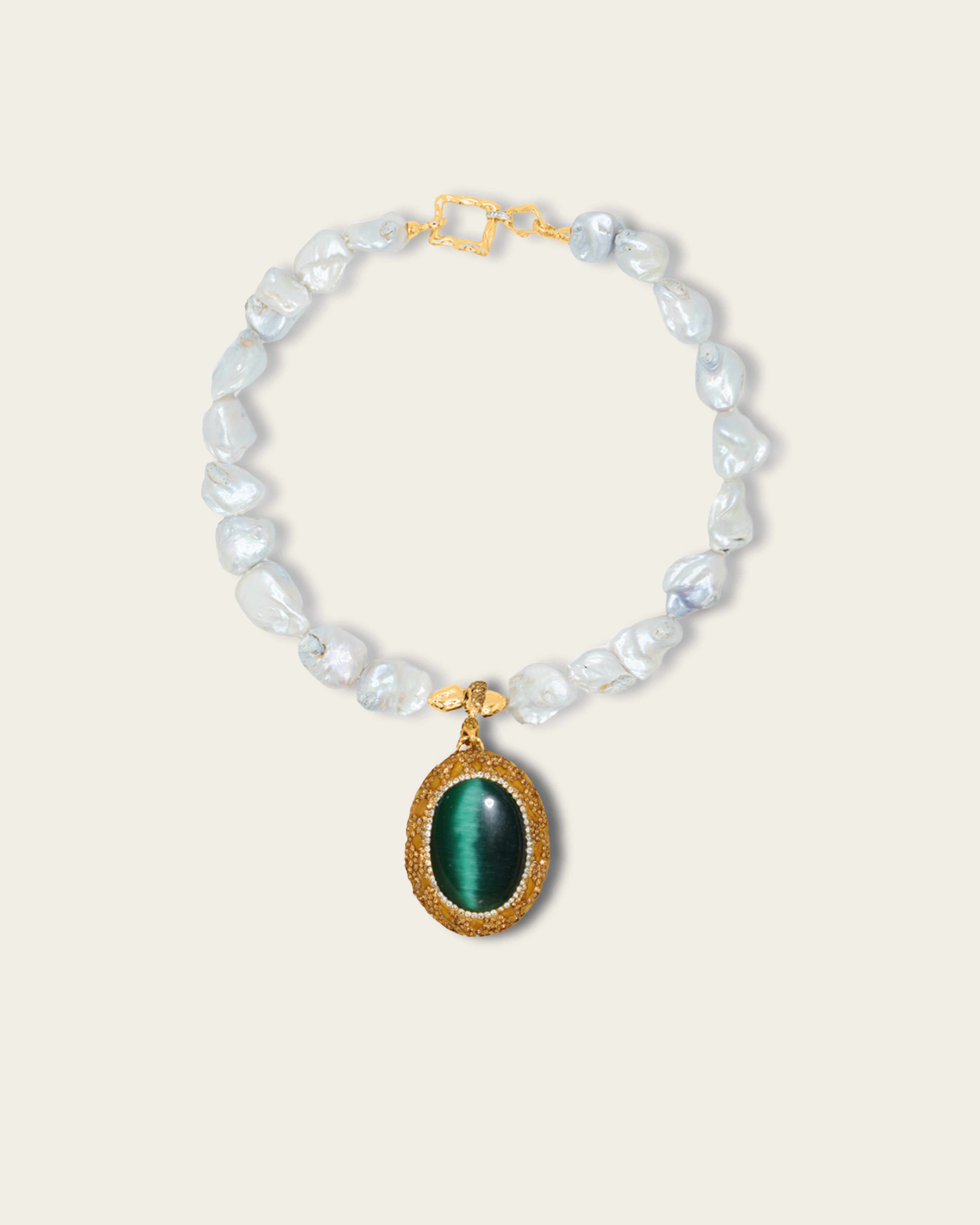 The Regalia Necklace — commanding and iconic, this oversized cat’s eye pendant is paired with chunky baroque pearls and accented in radiant gold. Available in four striking colorways — Green, Blue, Red, and Violet — this demi-fine collector’s necklace balances oversized proportions with timeless allure. Finished in 2µ (AAA) hard gold-plated copper, it is designed as a bold statement piece for modern icons, merging baroque pearl grandeur with gemstone brilliance. Handcrafted by Filipino artisans using responsibly sourced raw materials, and designed in Las Vegas.