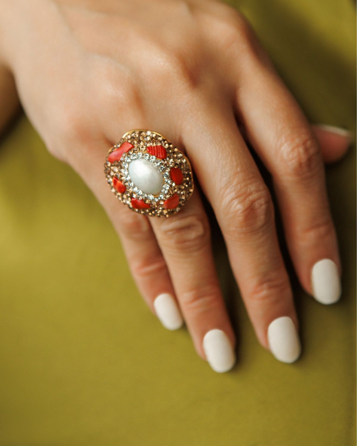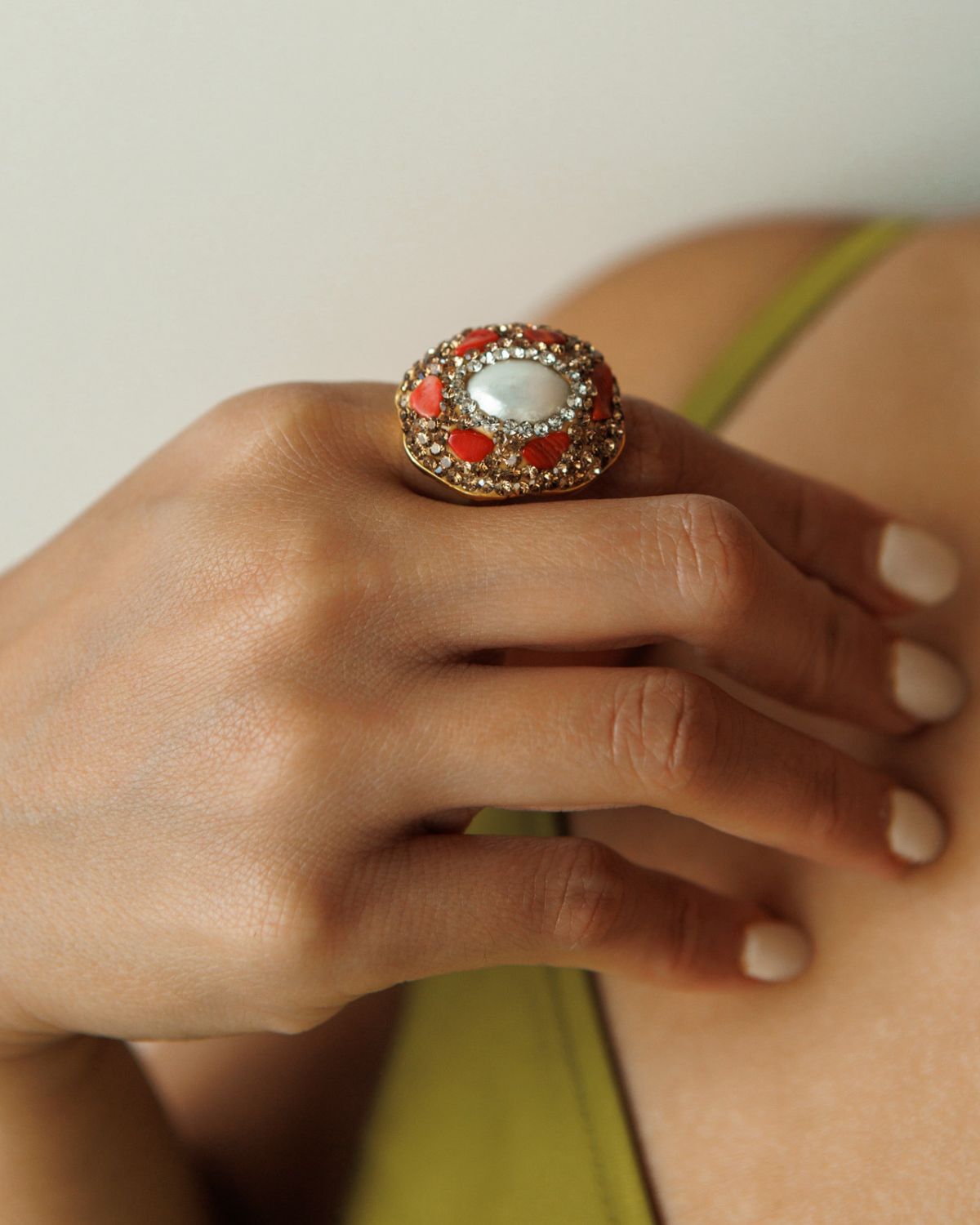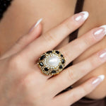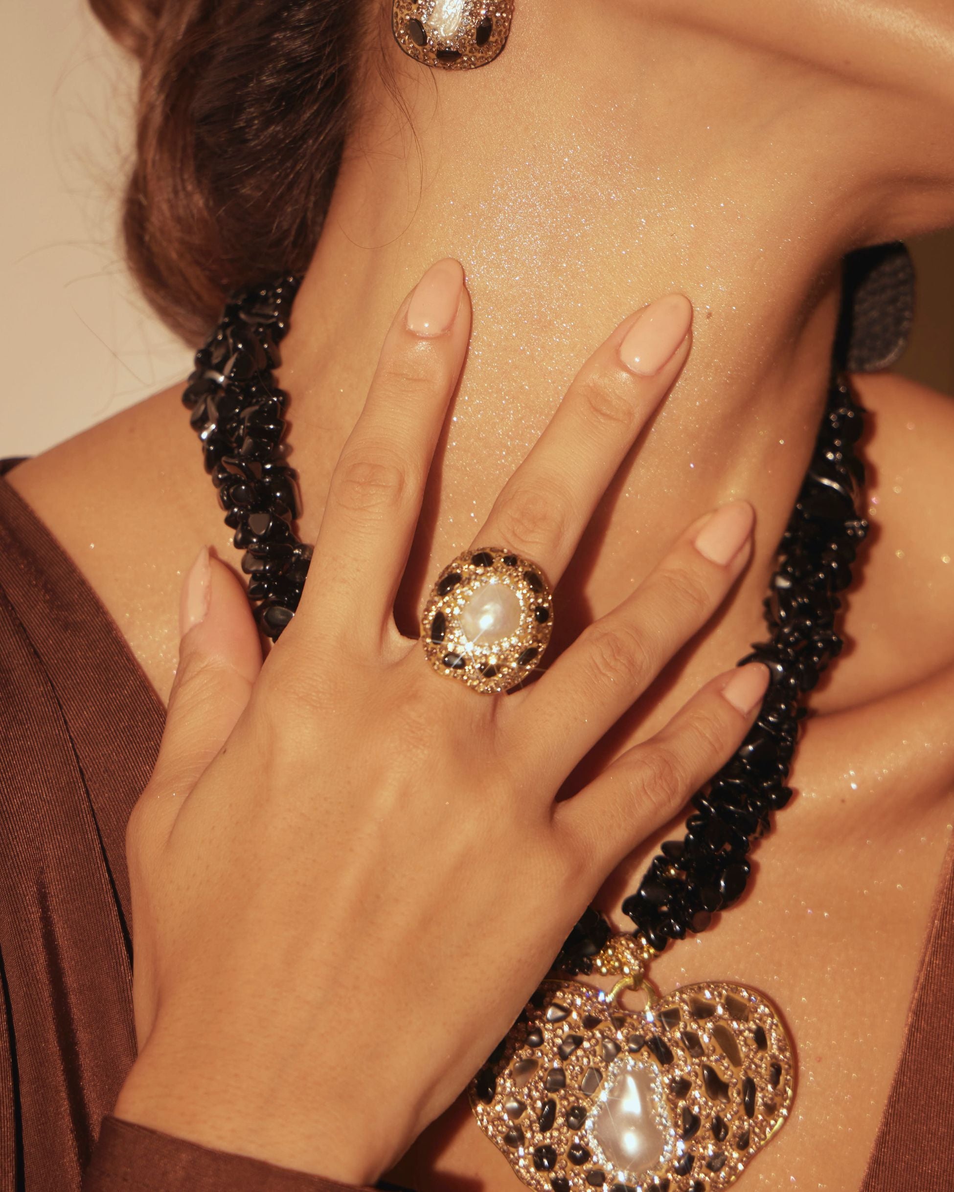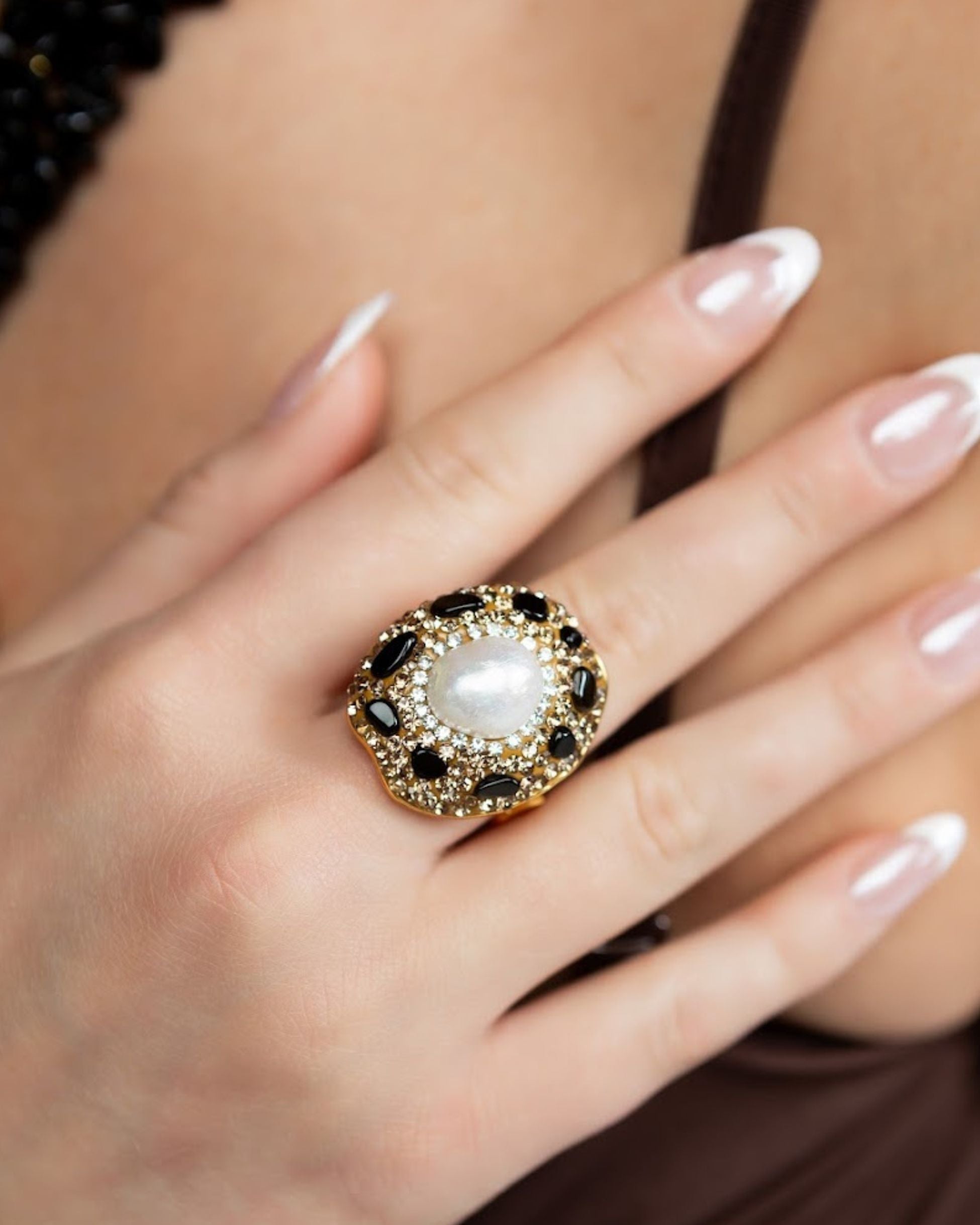 Nero Orb Cocktail Ring — commanding and opulent, this sculptural cocktail ring features a luminous freshwater pearl encircled by pavé crystal accents and dramatic black cabochons. Inspired by celestial spheres and the allure of the night sky, it is finished in 2µ (AAA) hard gold-plated copper for a radiant touch. A demi-fine collector’s piece, the Nero Orb Cocktail Ring is crafted for modern muses and collectors who favor bold statement jewelry with unforgettable presence. Designed in Las Vegas and handcrafted by Filipino artisans using responsibly sourced raw materials.