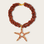 Sirena Necklace — a starfish-shaped gemstone pendant available in multiple colorways, accented with a luminous baroque pearl centerpiece and strung with bold jade chips. Finished in 2µ (AAA) hard gold-plated copper, this demi-fine statement necklace celebrates the natural beauty of gemstones and pearls. Designed in Las Vegas and handcrafted with intention by Filipino artisans using responsibly sourced raw materials from Asia, it is perfect as a striking bridal piece or an everyday heirloom.