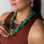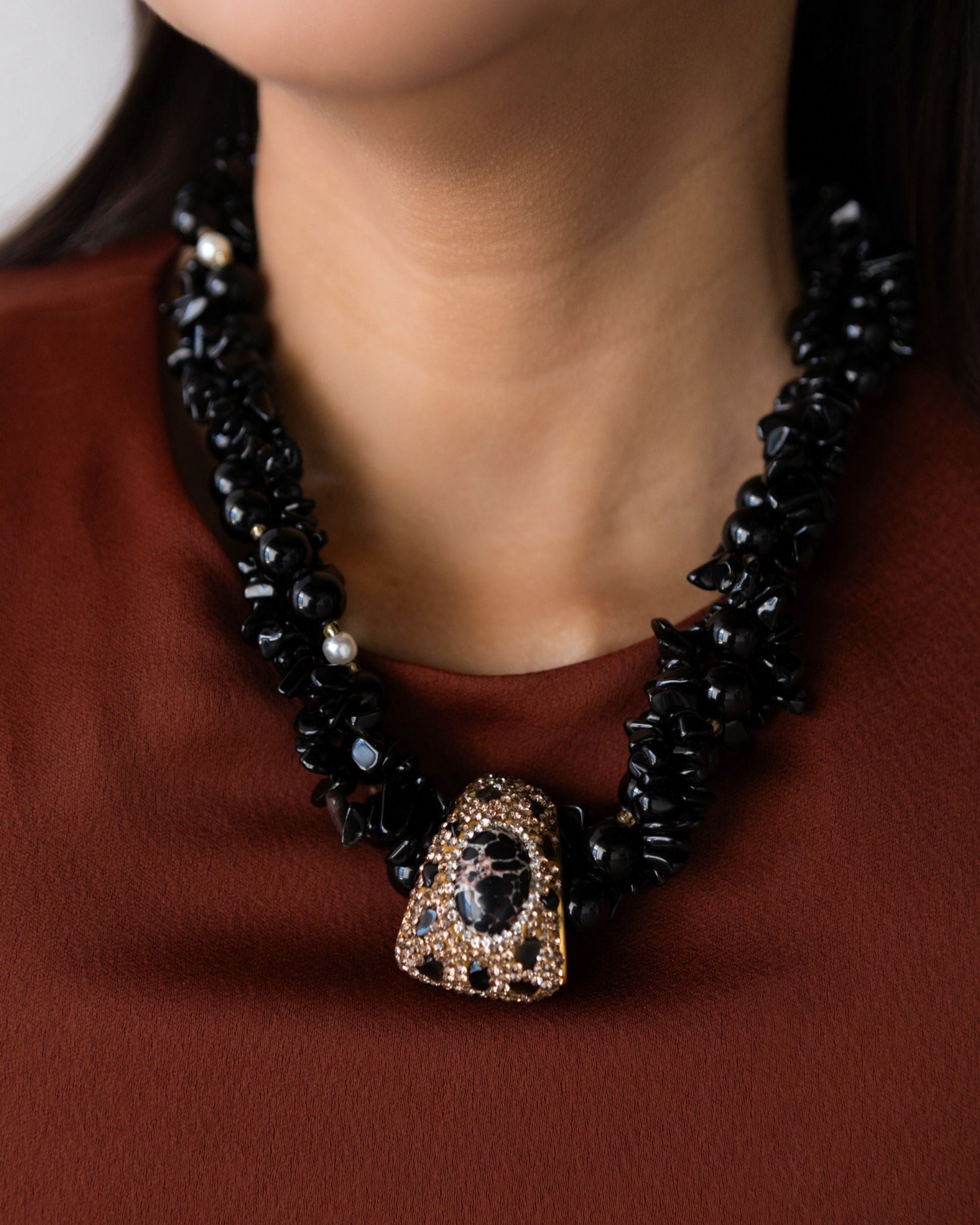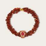 Solara Necklace — make a bold impression with this trapezoid-shaped gemstone pendant necklace, available in multiple colorways and accented with a luminous coral centerpiece. Strung with vibrant jasper chips and finished in 2µ (AAA) hard gold-plated copper, this demi-fine statement piece blends earthy textures with radiant coral for a striking collar necklace or modern heirloom design. Designed in Las Vegas and handcrafted with intention by Filipino artisans using responsibly sourced raw materials from Asia.
