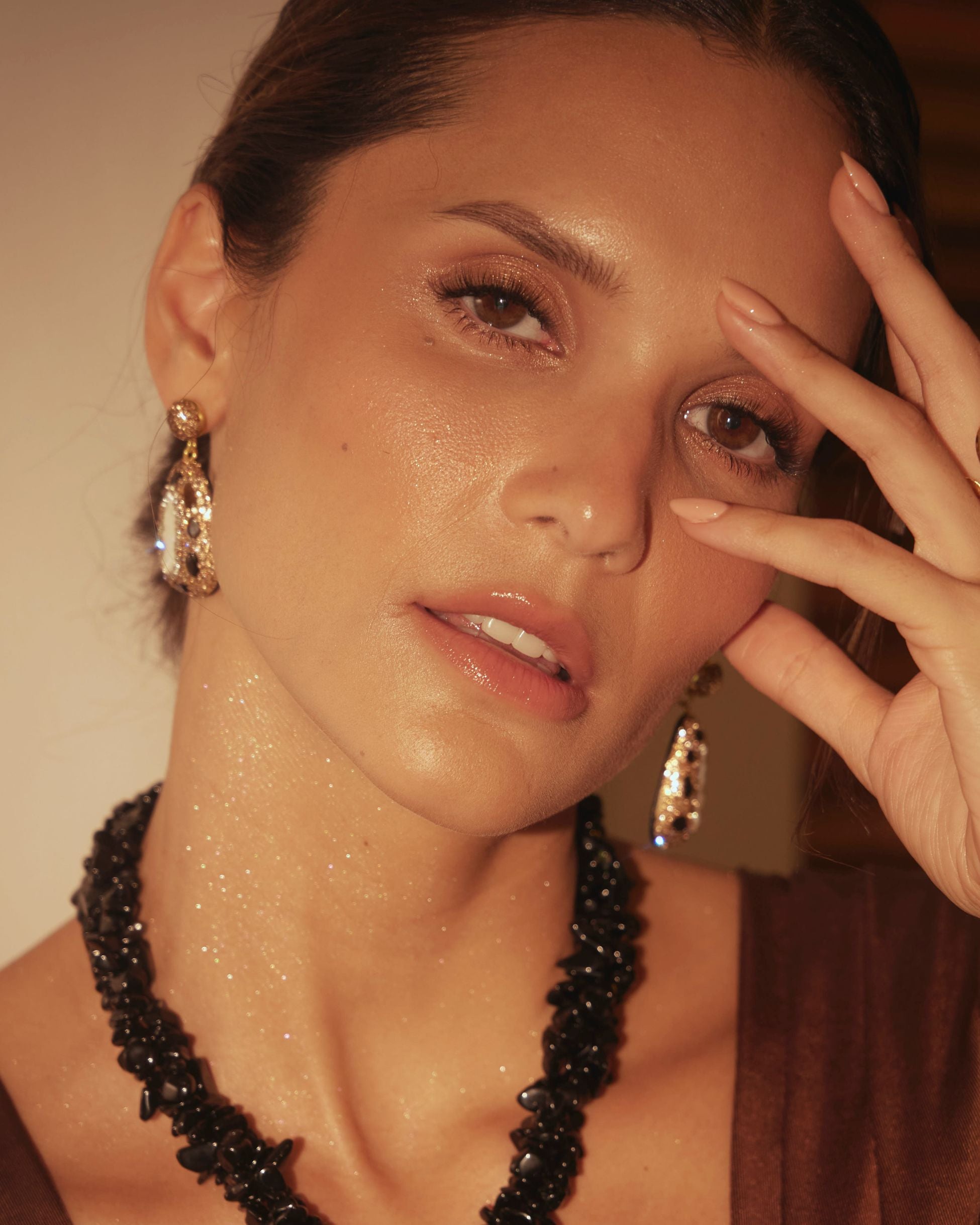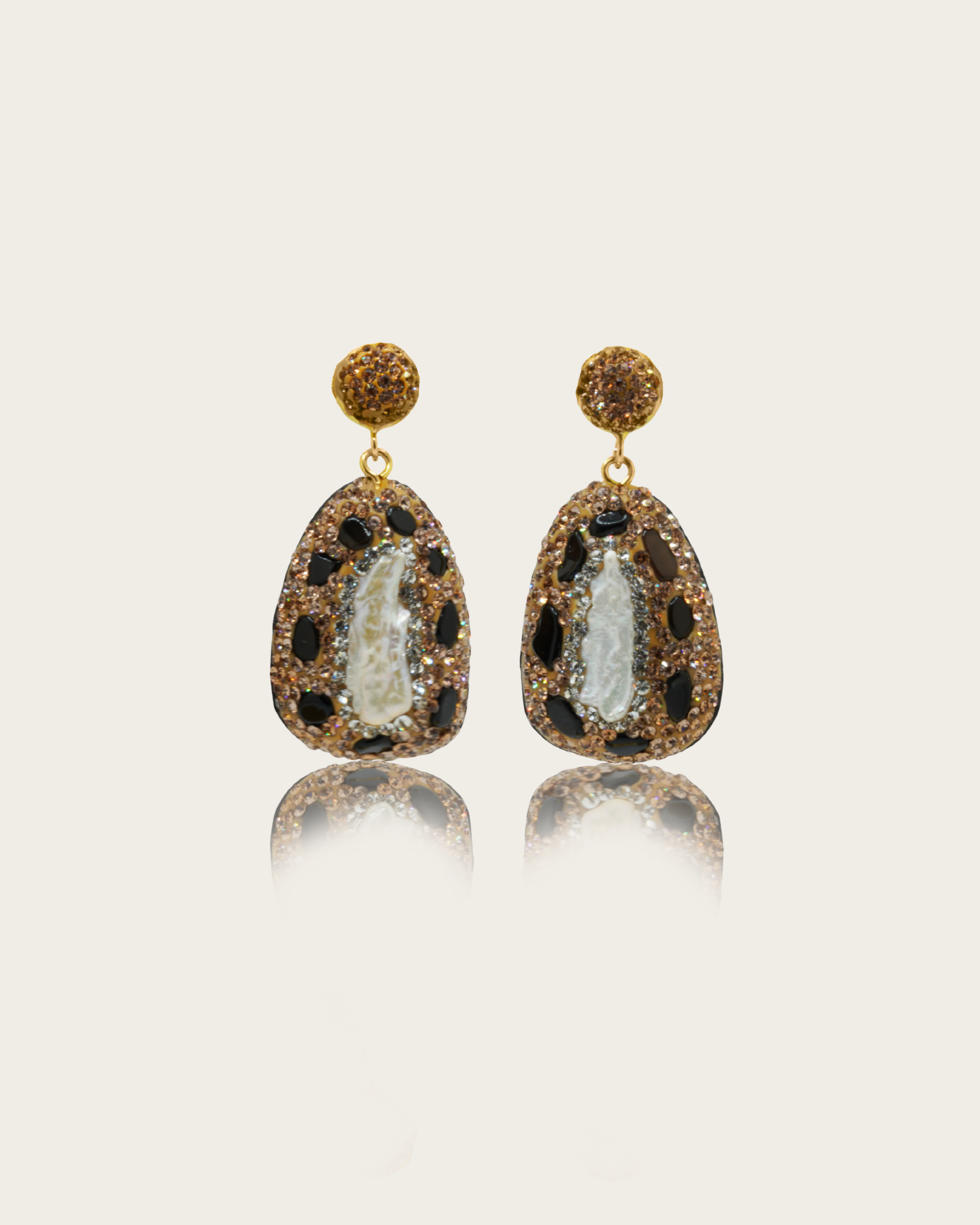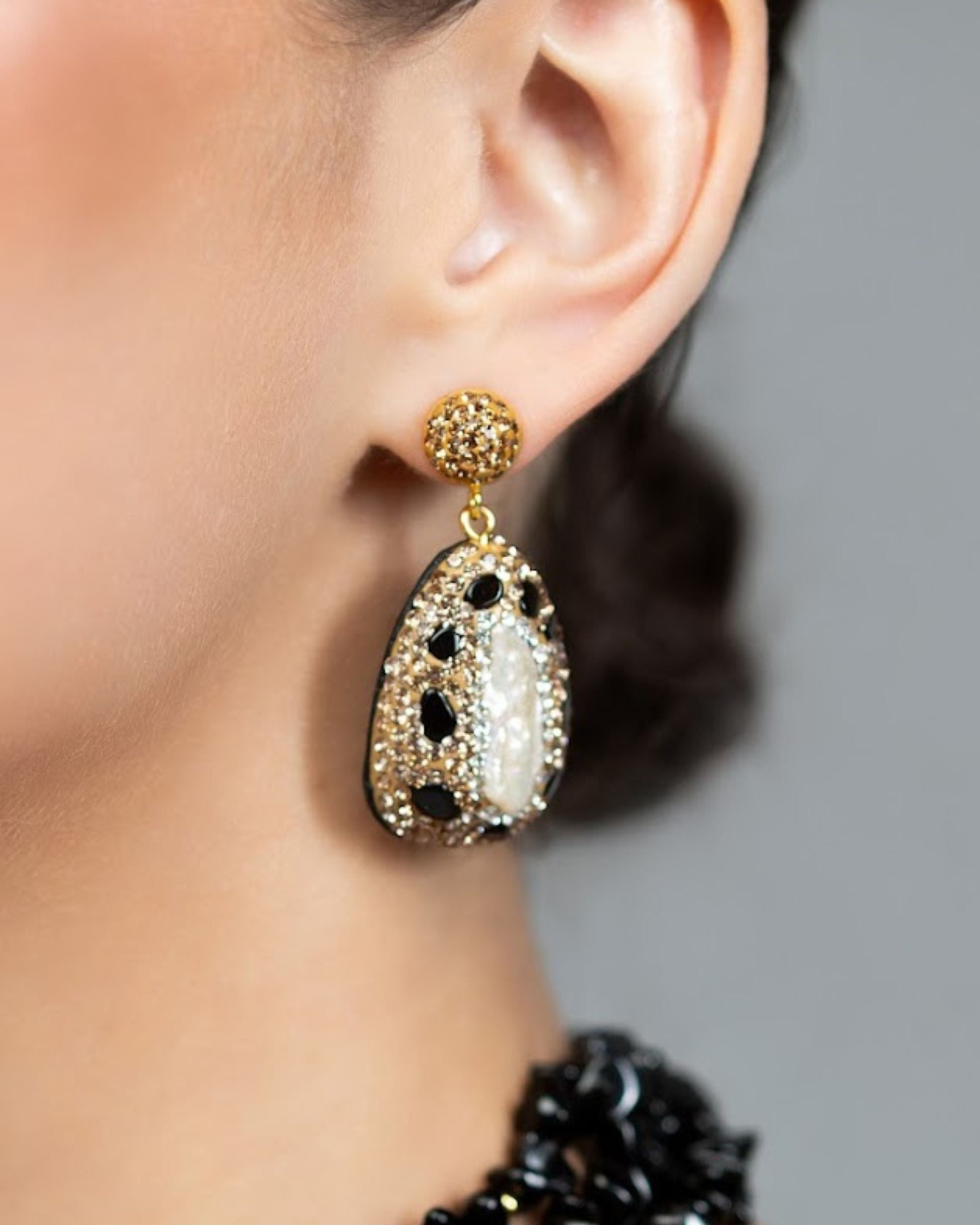 Nero Earrings — darkly alluring, these teardrop statement earrings capture the mystique of night with bold silhouettes and pavé crystal detailing. At the center, black gemstone cabochons shimmer with brilliance, striking a balance of drama and sophistication. Finished in 2µ (AAA) hard gold-plated copper, the Nero Earrings are a demi-fine collectible designed for modern muses, adding unmistakable edge to any evening look. Handcrafted with intention by Filipino artisans using responsibly sourced raw materials.