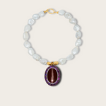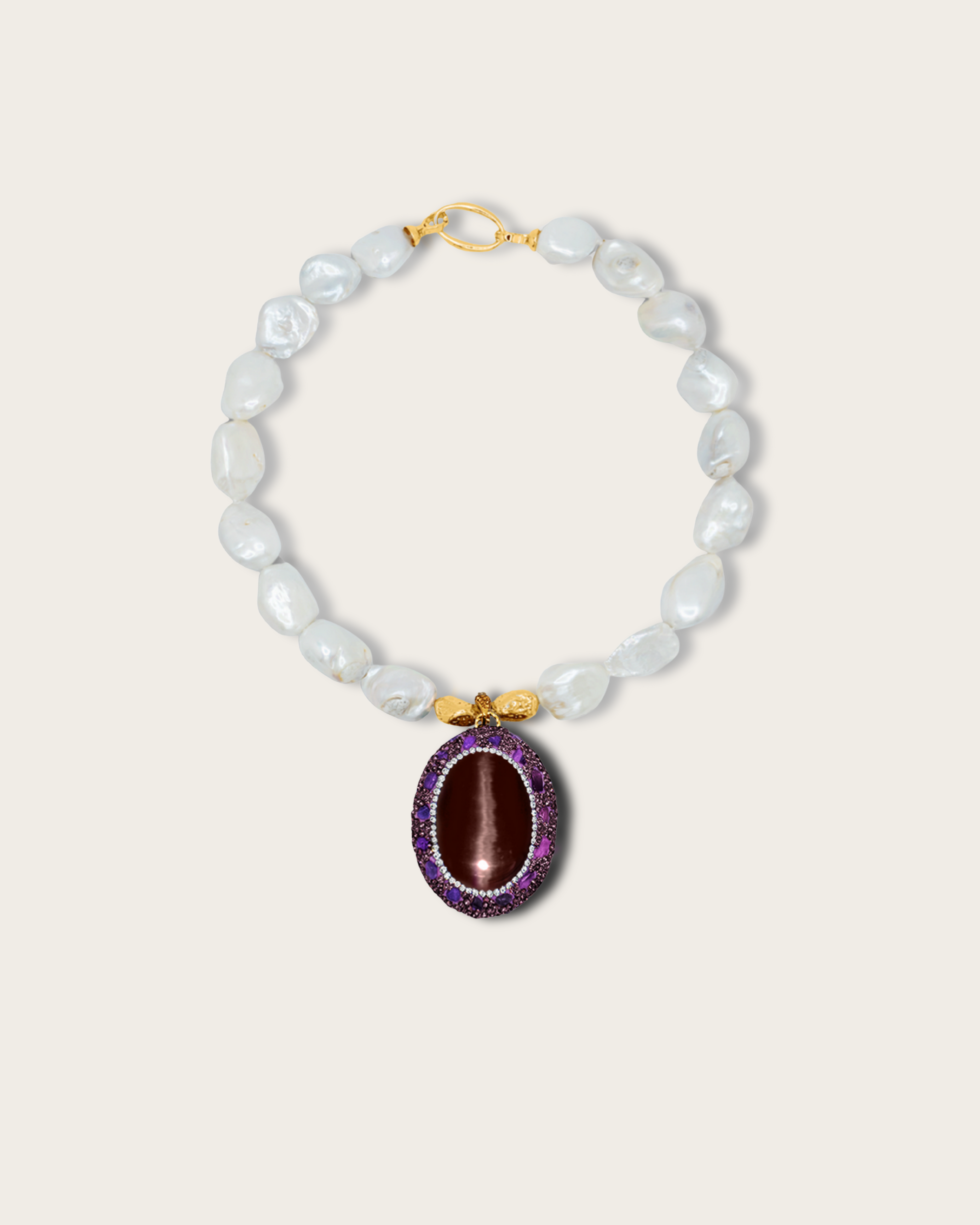 The Regalia Necklace — commanding and iconic, this oversized cat’s eye pendant is paired with chunky baroque pearls and accented in radiant gold. Available in four striking colorways — Green, Blue, Red, and Violet — this demi-fine collector’s necklace balances oversized proportions with timeless allure. Finished in 2µ (AAA) hard gold-plated copper, it is designed as a bold statement piece for modern icons, merging baroque pearl grandeur with gemstone brilliance. Handcrafted by Filipino artisans using responsibly sourced raw materials, and designed in Las Vegas.